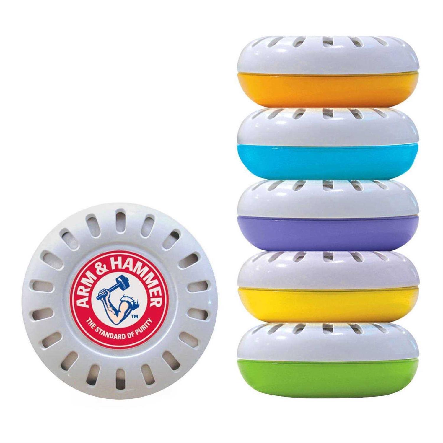 The stink ends here. Stick these deodorizing discs anywhere stink is with a convenient wall bracket system. From baby’s room to the bathroom, household odours can really sneak up on you. Now there’s a simple way to help rid your home of offensive smells. Arm & Hammer Nursery Fresheners with Brackets are small deodorizing discs powered by the natural odor-absorbing strength of Arm & Hammer baking soda, with convenient reusable wall brackets – so you can really stick it to smells! These small but mighty odour neutralizers snap easily into the wall brackets, which adhere easily to flat surfaces, from closet walls and dresser drawers to changing table sides – for instant freshness where you need it the most.