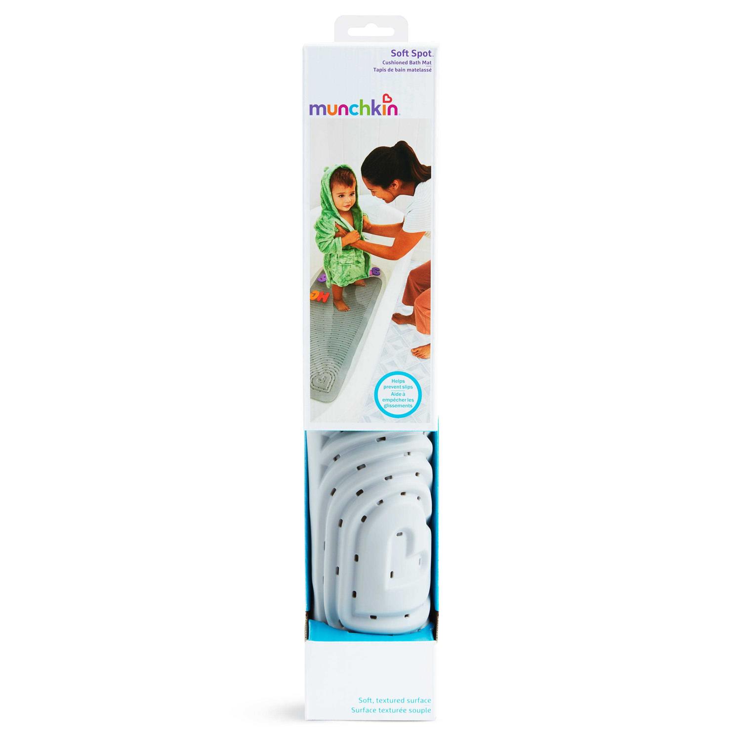 Munchkin Soft Spot Cushioned Bath Mat is a bath mat with grooves throughout the design creating a sturdy grip and extra comfort. Strong suction cups keep this mat secure to the base of the tub or shower – this mat will work with most smooth surfaces. Plus, drain holes help to prevent mold and mildew growth. Munchkin knows when it comes to bath time, safety comes first. Keep your little one from slipping and sliding with the Soft Spot cushioned bath mat. Great for baby or adults! Cushioned bath mat with built in grip Drain holes help prevent mold and mildew growth Strong hold suction cups keep mat in place Ripple pattern creates a soft, textured surface to provide extra security for little one Works with most smooth bath and shower surfaces BPA-free Bath mat measures 36” L x 17” W.
