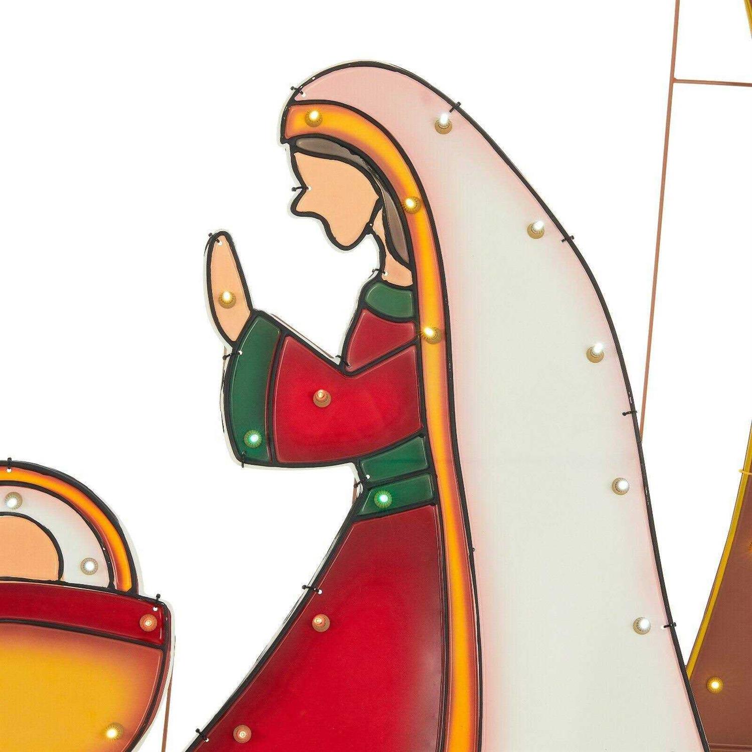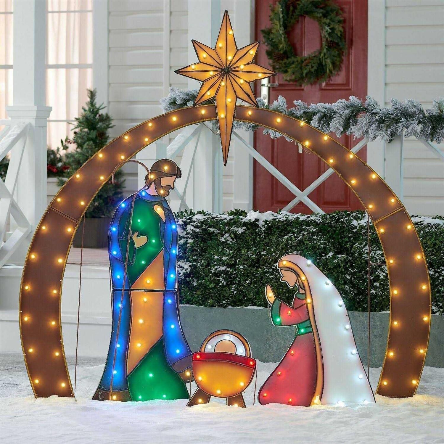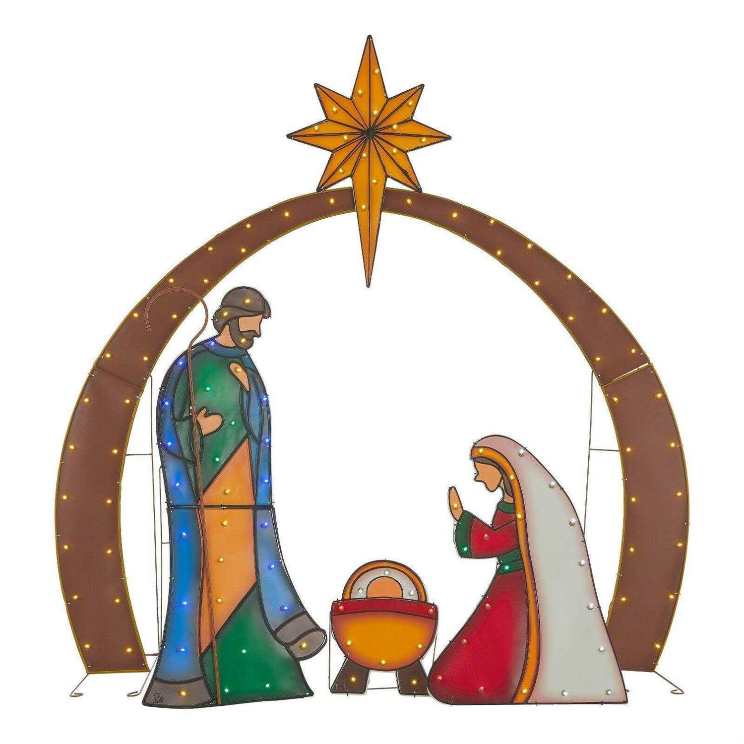 This set, which includes kneeling Joseph and Mary figures, baby Jesus and shining star above enclosing structure, is made with a metal frame and fabric material that is strong and durable to provide many years of enjoyment. Set is pre-lit with 250 white LED lights that make this decoration sparkle and shine. This holiday trimming can be displayed in indoor or outdoor locations.