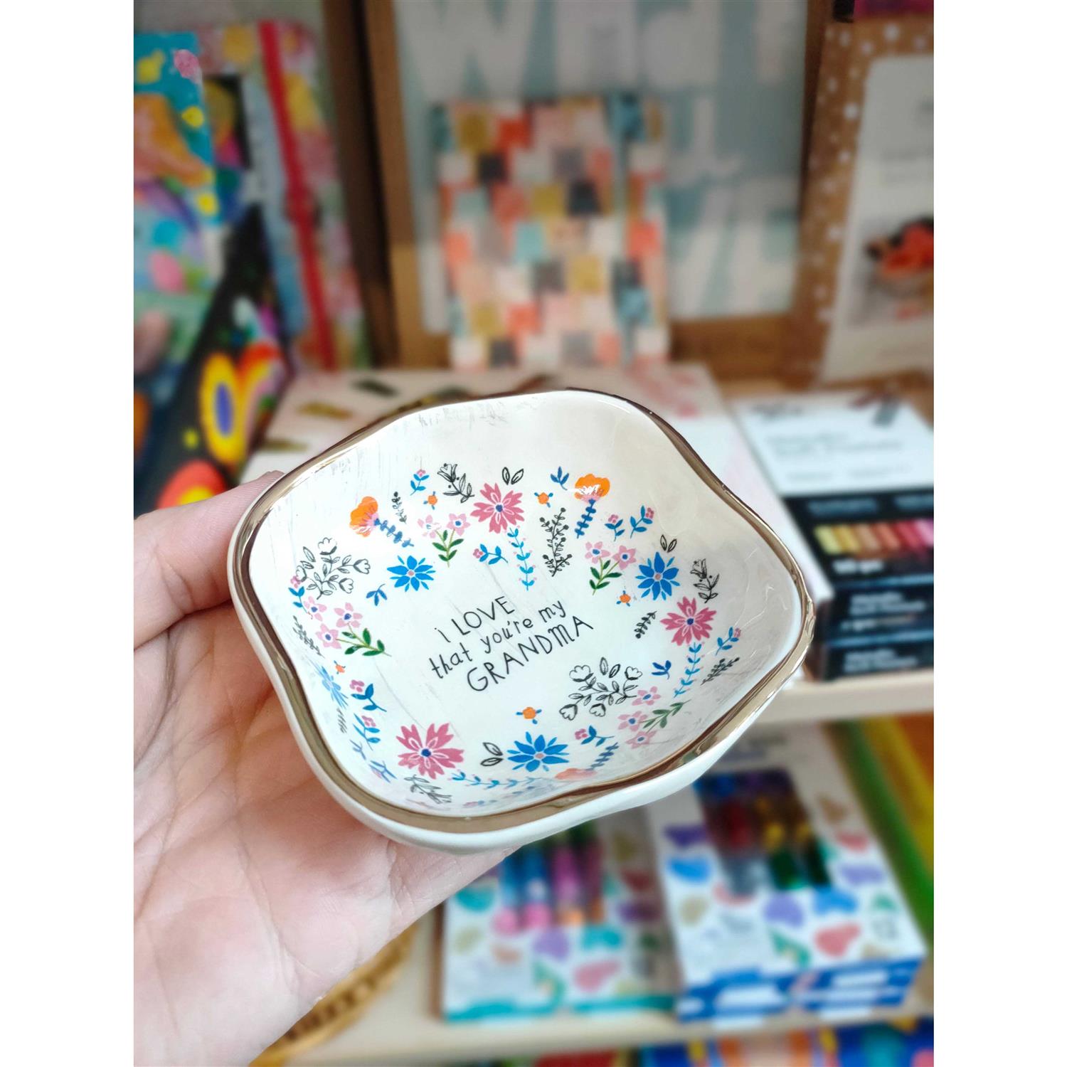 Who doesn’t love collecting little trinket dishes? This round hand-molded Antiqued Trinket Dish features hand painting and a sweet sentiment “I love that you’re my Grandma”. It makes a perfect and meaningful gift and will be an everyday reminder of how special they are! Each one is made to look antiqued so slight variations occur. Approximately 3.17″ x 3″. Shaped colorful hand-molded trinket bowl features a gold-rimmed edge. Ceramic. Designed with love by Natural Life in Ponte Vedra Beach, Florida.