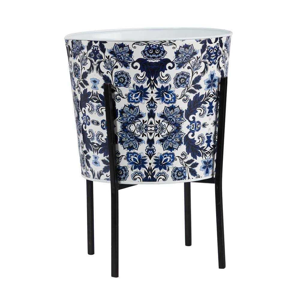 16 in. Oriental Blue and White Classic Round Metal Planter with Stand
