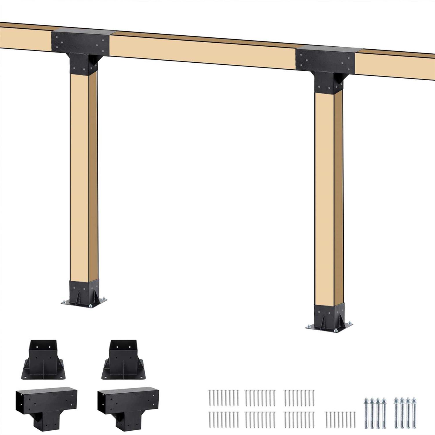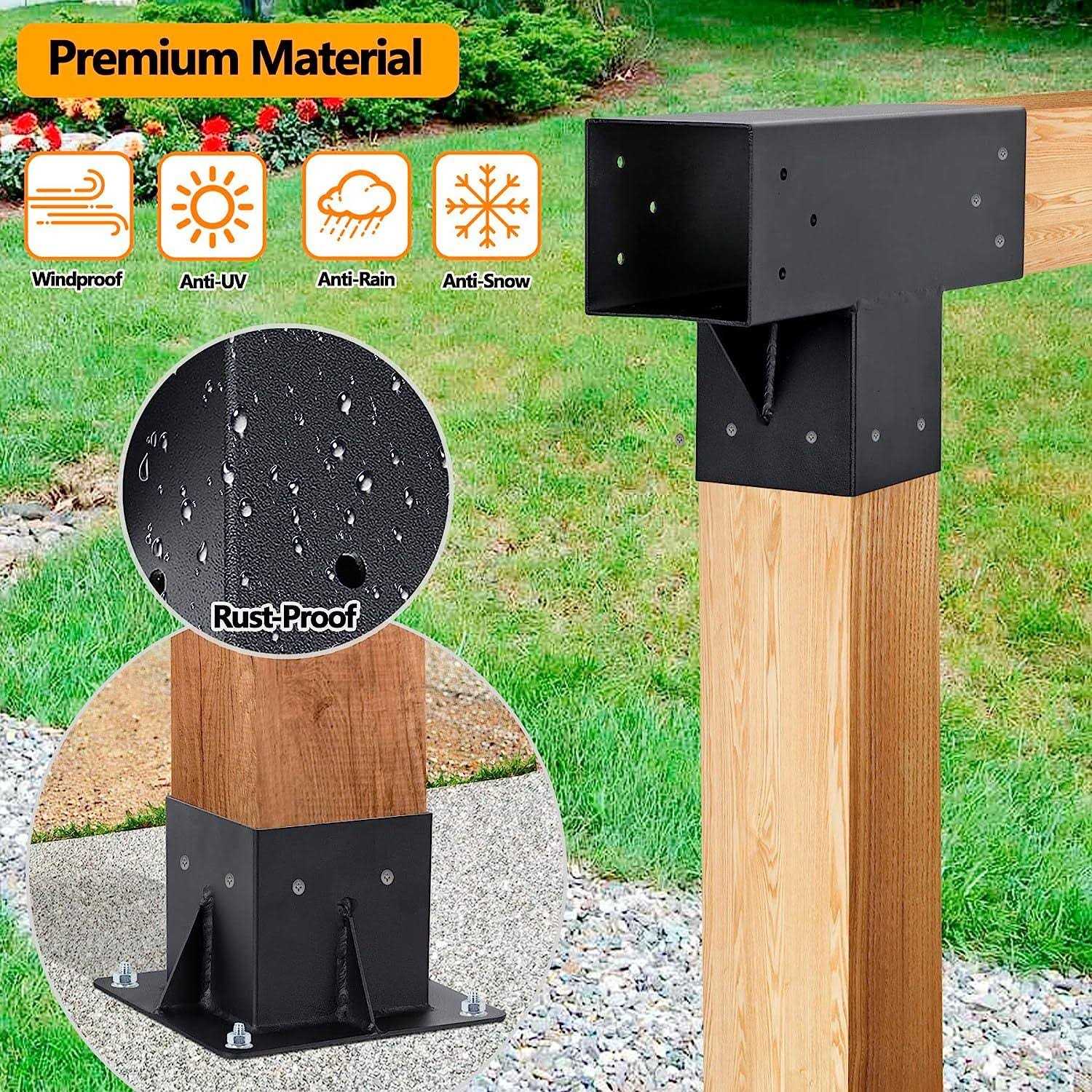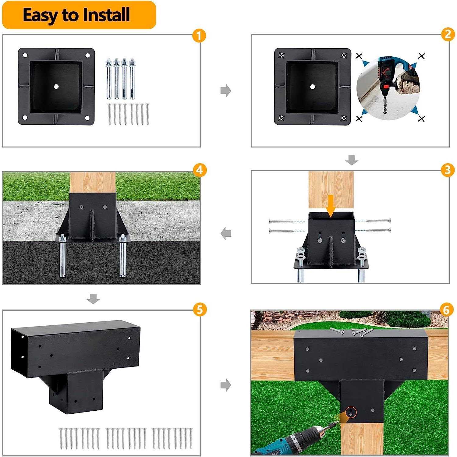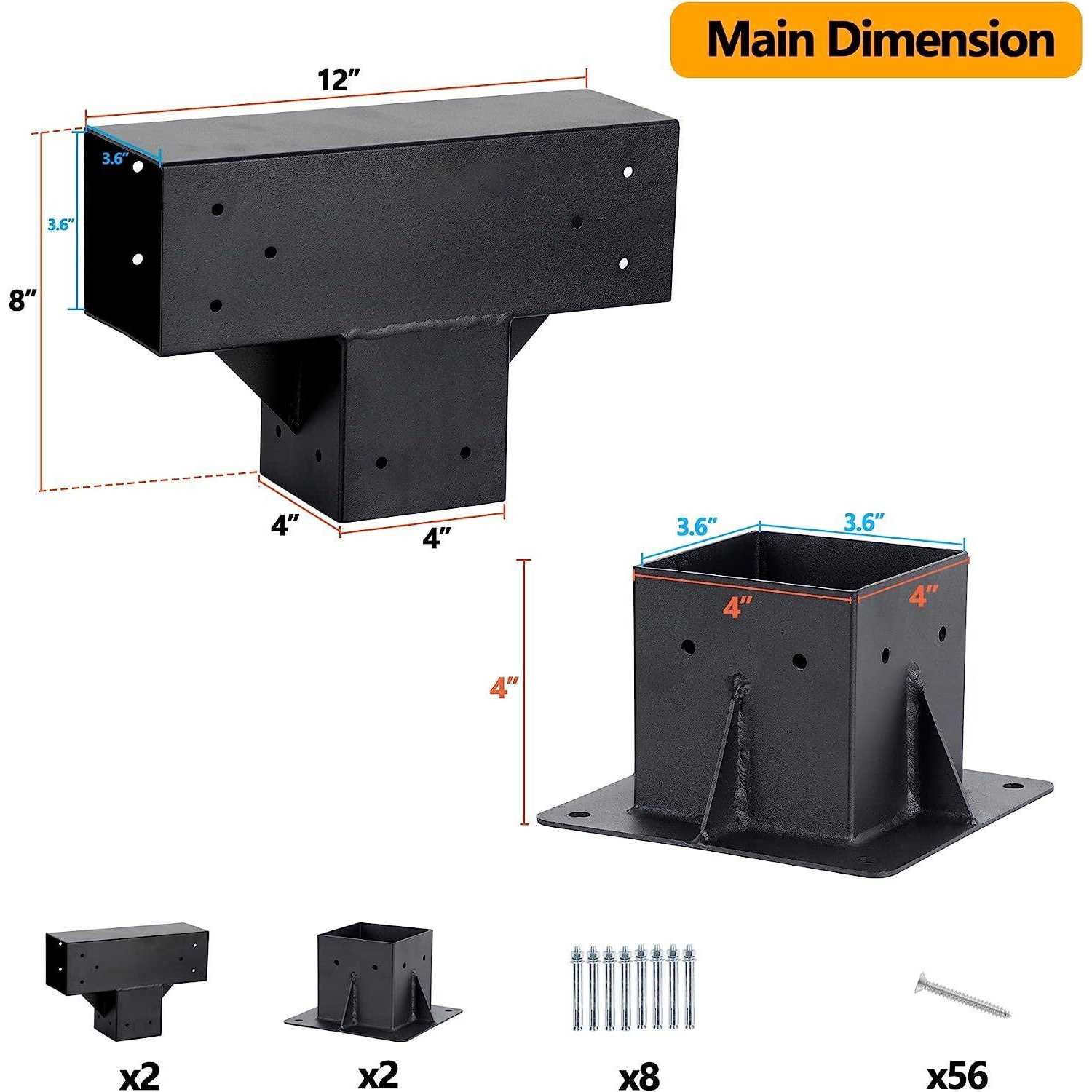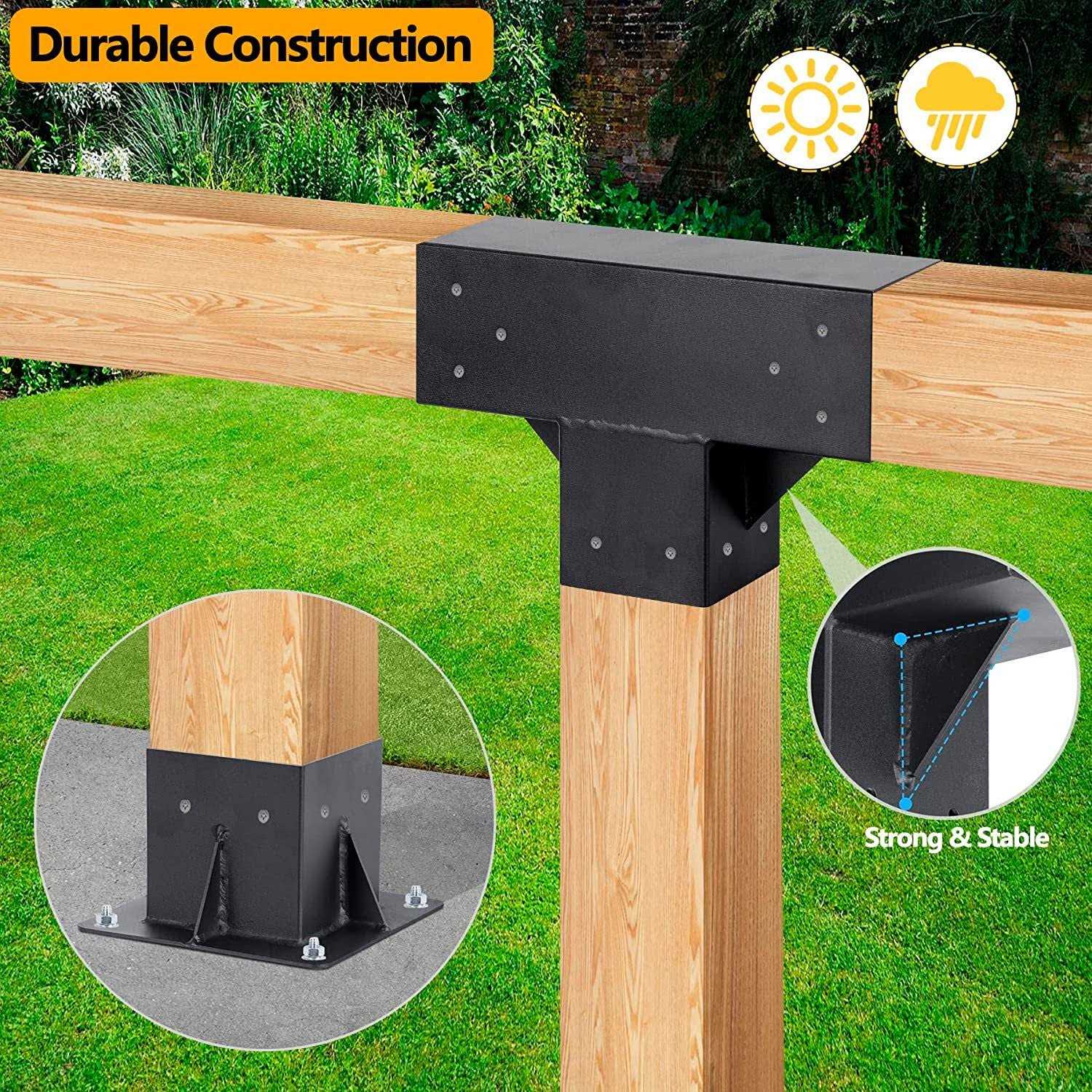 【Premium Material】: The pergola Bracket made of 2mm thick steel and outdoor coated finish, high-strength welded structure, solid and durable, anti-corrosion and rust prevention. 【Main Dimension】: The size of pergola bracket is 3.6 X 3.6 inch, this size is suitable for the nominal standard 4 “x 4” wooden post (the actual 3.5 “x 3.5″ wooden post on the market); The actual size has a slight error, usually around 1mm. 【Pergola Brackets with Corner】: The black 4×4 brackets for post has durable, long service time of load-bearing performance which made of carbon steel with black powder coated, very strong and rust resistant. The structure is designed to cover the entire end of the wooden beams so that the wood does not rot from years of rain and sun. 【Easy to Install】: Each pergola kit has pre-drill holes for easy installation. All of accessories in package help you assemble quickly and simply. 【Widely Uses】: Pergola brackets 4×4 are multi-functional, can be used for wooden post of pergola, gazebo, shed, garden furniture p Introduction /b – Our pergola post base supplied with 2 brackets shoulders and 2 brackets boots with scratch and rust resistance. It features 0.1” thickness steel plate has been sandblasted, and powder coated. The ideal choice for you build a stable and amazing pergola. – Features /b – Essential Building Material: Grid pergola kit is essential to building a stable building that can last for years – Effortless Installation: Each pergola kit has pre-drill holes for easy installation. All of accessories in package help you assemble quickly and simply. – Rust-Proof: Wooden gazebo kit is made of premium material with coated outdoor black powder, rust prevention, corrosion protection, durable, durable process, bearing performance for many years. – Stability: The deck post anchor 4×4 is designed for keep the stability of buildings and furniture which cover the entire end of the wooden beams so that the wood does not rot from years of rain and sun. – Combine multiple with you mind: You can combine several wooden gazebo kit to build a different shape of the building. – Wide Range of Applications:Pergola brackets 4×4 are multi-functional, can be used for be used for wooden post of pergola, gazebo, shed, garden furniture. – Specifications: /b – Size: 4 “x 4″(actual 3.5″x3.5”) – Package Content /b – 2 X Pergola Base Bracket – 2 X Pergola Bracket with Corner – A Set of Accessories /p