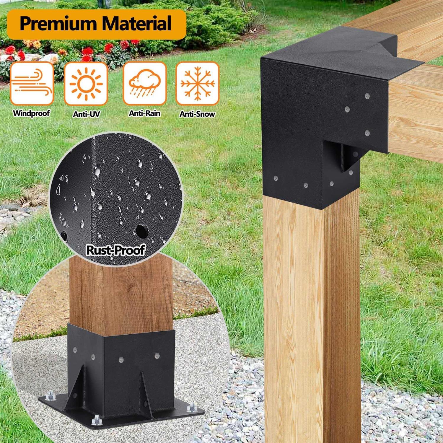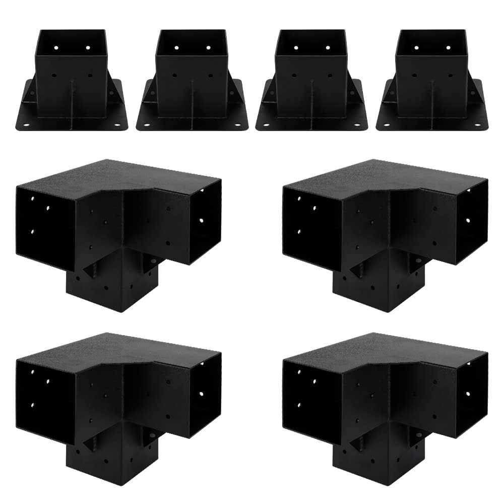 【Premium Material】: The pergola Bracket made of 2mm thick steel and outdoor coated finish, high-strength welded structure, solid and durable, anti-corrosion and rust prevention. 【Main Dimension】: The size of pergola bracket is 3.6 X 3.6 inch, this size is suitable for the nominal standard 4 “x 4” wooden post (the actual 3.5 “x 3.5″ wooden post on the market); The actual size has a slight error, usually around 1mm. 【3-Way Right Corner Brackets】: The black 4×4 brackets for post has durable, long service time of load-bearing performance which made of carbon steel with black powder coated, very strong and rust resistant. The structure is designed to cover the entire end of the wooden beams so that the wood does not rot from years of rain and sun. 【Easy to Install】: Each pergola kit has pre-drill holes for easy installation. All of accessories in package help you assemble quickly and simply. 【Widely Uses】: Pergola brackets 4×4 are multi-functional, can be used for wooden post of pergola, gazebo, shed, garden furniture p Introduction /b – Our pergola post base supplied with 4 brackets shoulders and 4 brackets boots with scratch and rust resistance. It features 0.1” thickness steel plate has been sandblasted, and powder coated. The ideal choice for you build a stable and amazing pergola. – Features /b – Essential building material: Grid pergola kit is essential to building a stable building that can last for years – Effortless Installation: Each pergola kit has pre-drill holes for easy installation. All of accessories in package help you assemble quickly and simply. – Rust-Proof: Wooden gazebo kit is made of premium material with coated outdoor black powder, rust prevention, corrosion protection, durable, durable process, bearing performance for many years. – Stability: The deck post anchor 4×4 is designed for keep the stability of buildings and furniture which cover the entire end of the wooden beams so that the wood does not rot from years of rain and sun. – Combine multiple with you mind: You can combine several wooden gazebo kit to build a different shape of the building. – Wide Range of Applications:Pergola brackets 4×4 are multi-functional, can be used for be used for wooden post of pergola, gazebo, shed, garden furniture. – Specifications: /b – Size: 4 “x 4″(actual 3.5″x3.5”) – Package Content /b – 4 X 3-way Pergola Bracket /p