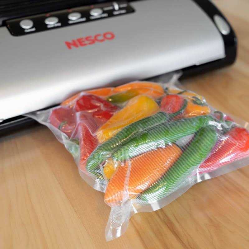 Keep foods fresh up to 5 times longer with the NESCO VS-02-VP Vacuum Sealer Starter Kit with 4 Rolls. Prepare whole meals in advance, save leftovers, or buy in bulk and seal for later. Fully automatic, one-touch operation, and automatic shut-off makes this vacuum sealer easy-to-use. The seal-only function prevents over vacuuming and crushing of delicate foods. This sealer also features an extended seal time function for thicker bags and moist foods. A convenient bag cutter enables you to create specific sized bags and the roll storage compartment fits up to 11.8 wide roll of bag material. Four 11 x 20rolls give you a total of 80 feet in length to make custom sized-bags; enough to handle your garden harvest or jerky processing. NESCO VS-02-VP Vacuum Sealer Starter Kit is compatible with any brand of vacuum sealer bags.
