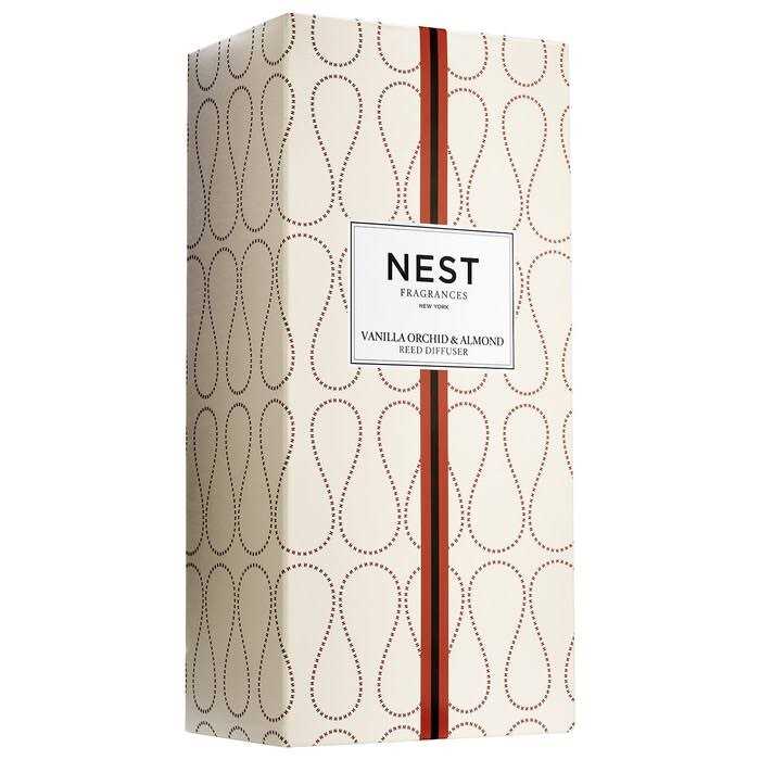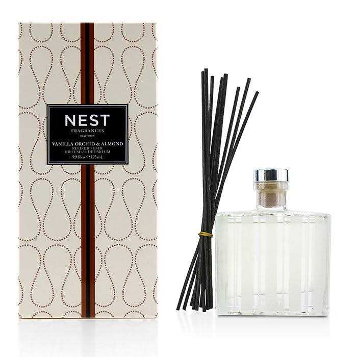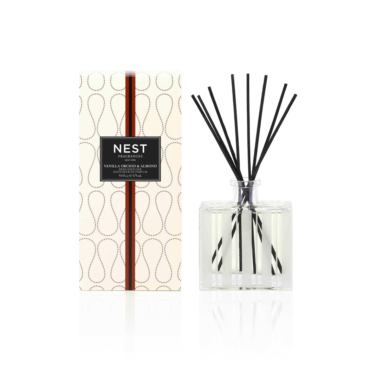 The Vanilla Orchid & Almond reed diffuser by NEST Fragrances provides a warm, nutty aroma of Mediterranean almond with fruity accents of peach and apple infused with white orchid, the creaminess of coconut milk and oriental base notes of vanilla, amber, musk and patchouli. NEST Fragrances diffusers are carefully crafted with the highest quality fragrance oils and are designed to continuously fill your home with a lush, memorable fragrance. The alcohol-free formula releases fragrance slowly and evenly into the air for approximately 90 days.