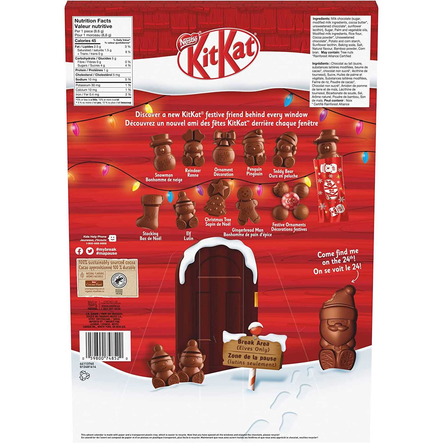 - Behind all 24 windows is a festively-shaped, milk chocolate-covered crispy KITKAT wafer surprise, individually wrapped to delight each day.