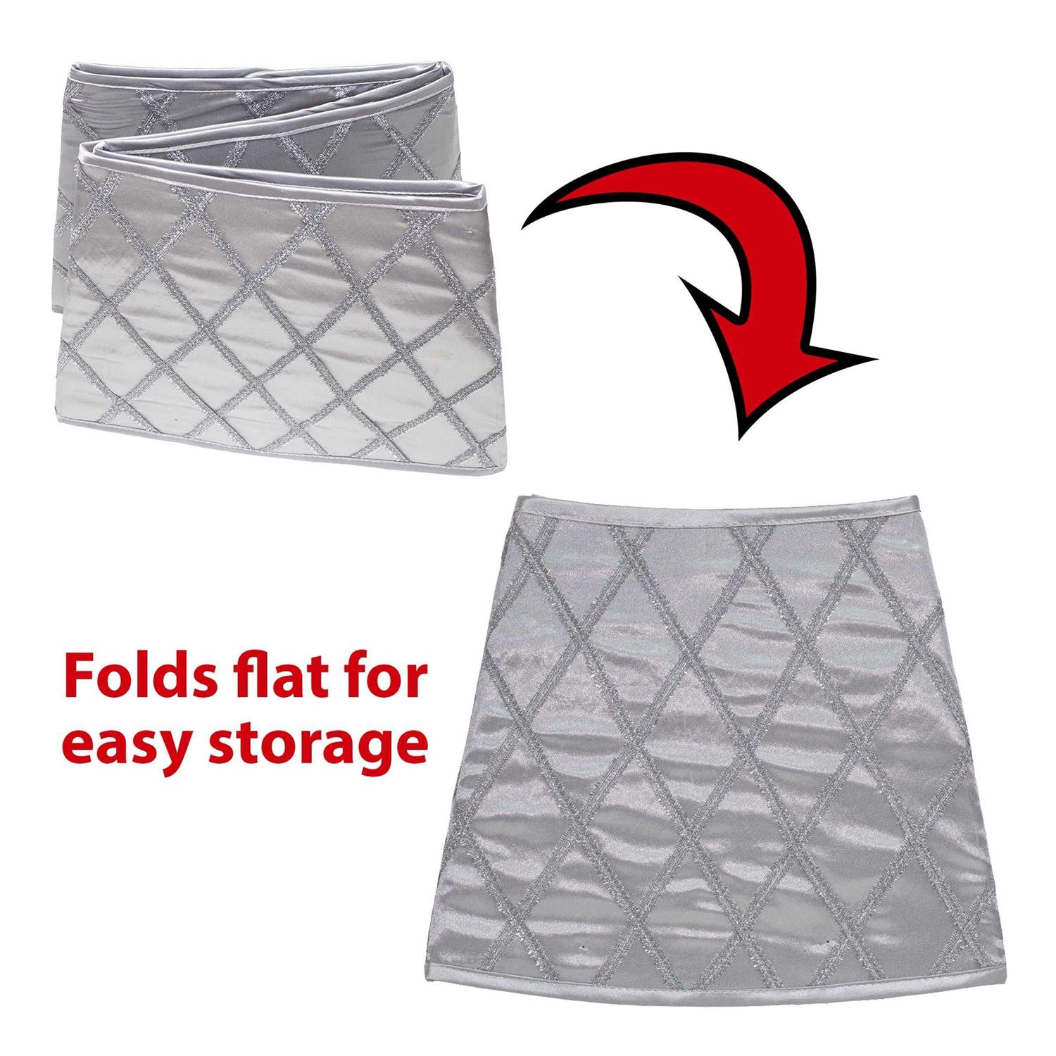 Your Christmas tree is trimmed, the lights are sparkling, everything looks perfect for Christmas morning photos. except for the sight of that clunky metal or plastic tree stand. Bring the magic of your holiday decorations all the way to the floor with the New Traditions Silver Tinsel Criss Cross Stand Band, a beautiful addition or alternative to a traditional Christmas tree skirt. This Christmas tree collar lets you hide unattractive tree bases and keep children and pets away from the tree bottom, but unlike a tree skirt, the xmas tree collar eliminates the need to use a steamer to remove wrinkles or worry about the material lying smoothly. Measuring 11 in. tall and with a 26 in. Dia base, this tree ring collar fits most tree stands for both natural and artificial Christmas trees. The stand band is made from a silver satin polyester material decorated with glittery tinsel in a crisscross pattern. The base and top of the Christmas tree collar are trimmed with a solid silver fabric edging to give it an elegant, finished look. The collapsible stand band is extremely easy to assemble – simply insert 2 plastic tubes through the elastic loops around the top and bottom of the tree collar and it’s ready to use. When it’s time to put away the holiday decorations, it easily disassembles and folds flat for storage. This New Traditions stand band makes a beautiful accessory for any natural or artificial Christmas tree.