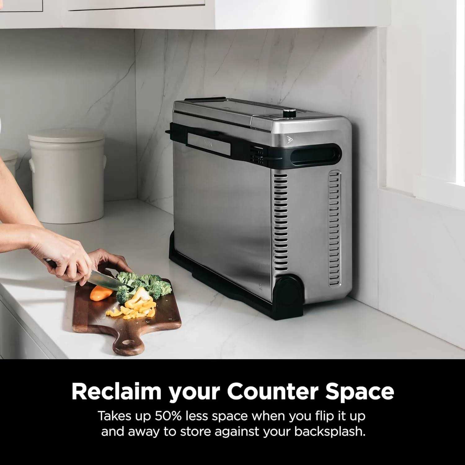 Reclaim your counter space: Takes up 50 % less space when you flip it up and away to store against your backsplash.