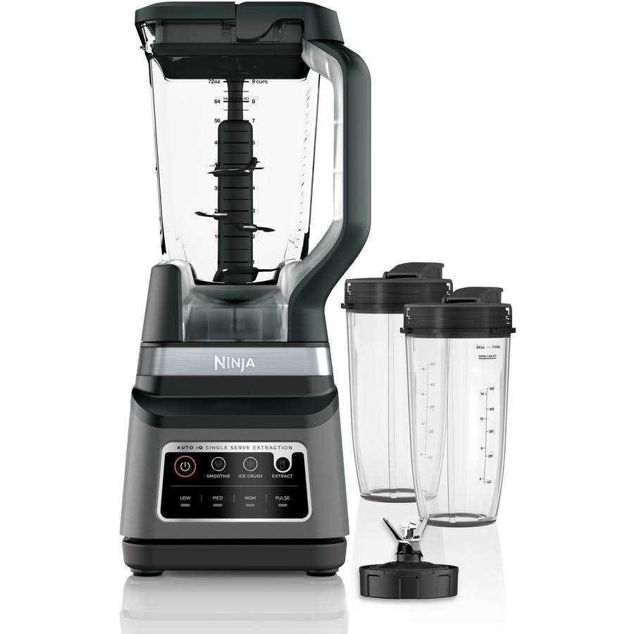 The Ninja Professional Plus Blender DUO with Auto-iQ features a new modern design and a more powerful motor than Ninja’s original Professional Blender DUO. Versus BL621, based on operating wattage,Ninja Total Crushing Blades give you perfectly crushed ice for your smoothies and frozen drinks with 1400 peak watts of professional power.,The 72 oz. Total Crushing Pitcher is great for making large batches for the whole family.,The single-serve cups with spout lids make it easy to take delicious, nutrient-rich smoothies on the go.,3 preset Auto-iQ programs allow you to create smoothies, frozen drinks, and nutrient extractions, all at the touch of a button.