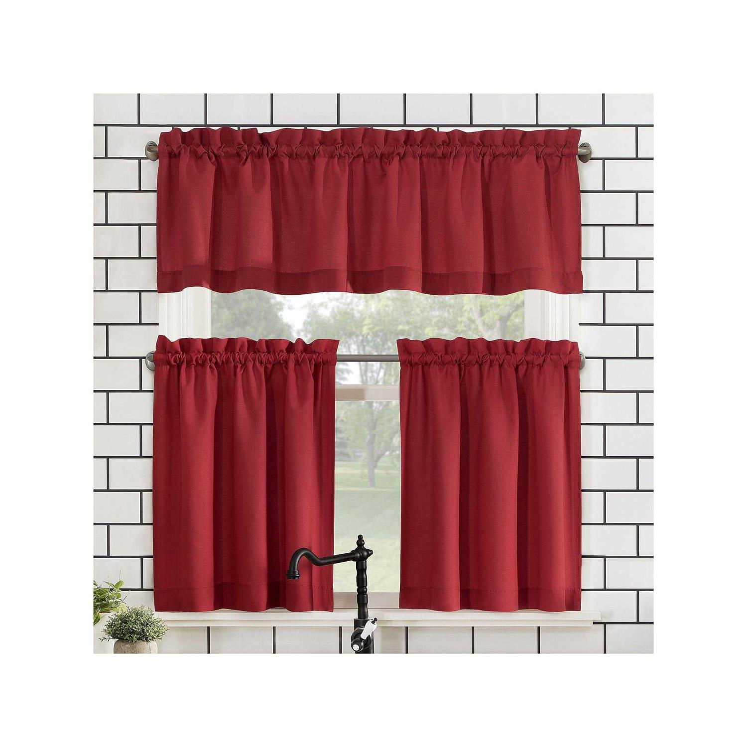 Dress up your small window with the No. The set includes 1 valance and 2 tier curtains in a variety of colors which will coordinate with any home decor. Machine wash cold, gentle cycle. Use only non-chlorine bleach when needed. Tumble dry low heat. Cool iron as needed. Set includes one valance and two tiers in color red measuring 54 inch width by 24 inch length. Measure carefully before selecting your desired size. Machine wash cold on gentle cycle. Use non-chlorine bleach when needed. Tumble dry on low heat, using a cool iron as needed.