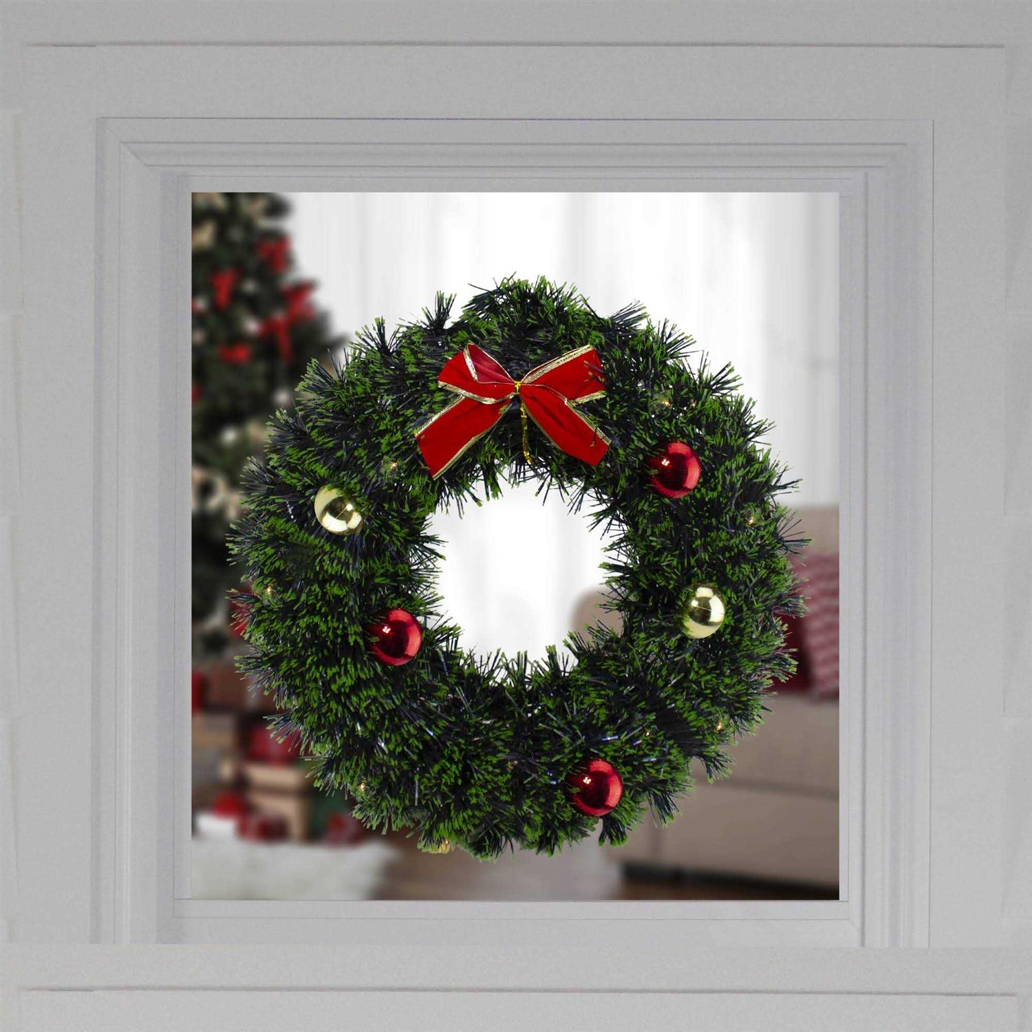 Are you feeling nostalgic this Christmas? Then this fun and festive wreath is the perfect choice for you. Constructed like a traditional pine wreath with incredible fullness and pre-decorated with mini ornaments, it is the perfect addition to any holiday decor. Product Features: Unlit Artificial tinsel two tone green wreath Wreath is designed with a red and gold bow Accented with red and gold mini ornament balls No assembly required – wreath comes in 1 piece Includes a plastic ring frame backing for hanging Dimensions: 17″ diameter x 3″ deep (measured from outermost tip/edge to outermost tip/edge across the wreath) Inner dimension: 7″ Material(s): tinsel/plastic/metal/fabric Note: Tinsel may be compressed for shipment, and would need to be fluffed out upon arrival to look like the photo.