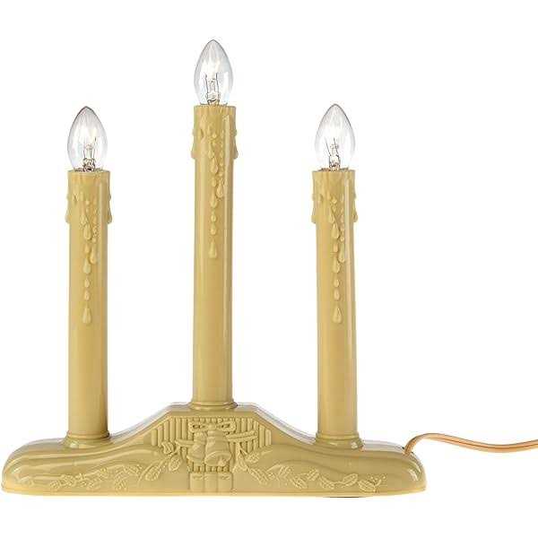 Add some light to your life with this beautiful Christmas chandelier candle lamps. The easy glow is sure to bring some sparkle to your Christmas decor. This universal light can also be used in a window sill, in a bedroom, to light your date nights and many other options. Product Features: Tiered Christmas Candolier. Faux dripping wax detail on candles for a realistic charm. Flame-tip bulbs give the appearance of real flames. 3 C7 bulbs are included (5 watts each). Gorgeous ivory colored base with bell and holly leaf molded design. 36 inch lead cord. Comes with replacement fuse. 120 volts, 60 hertz, 125 amps, 15 watts. Dimensions: 11 inch high x 7 inch diameter. Material(s): plastic/glass bulb/wire