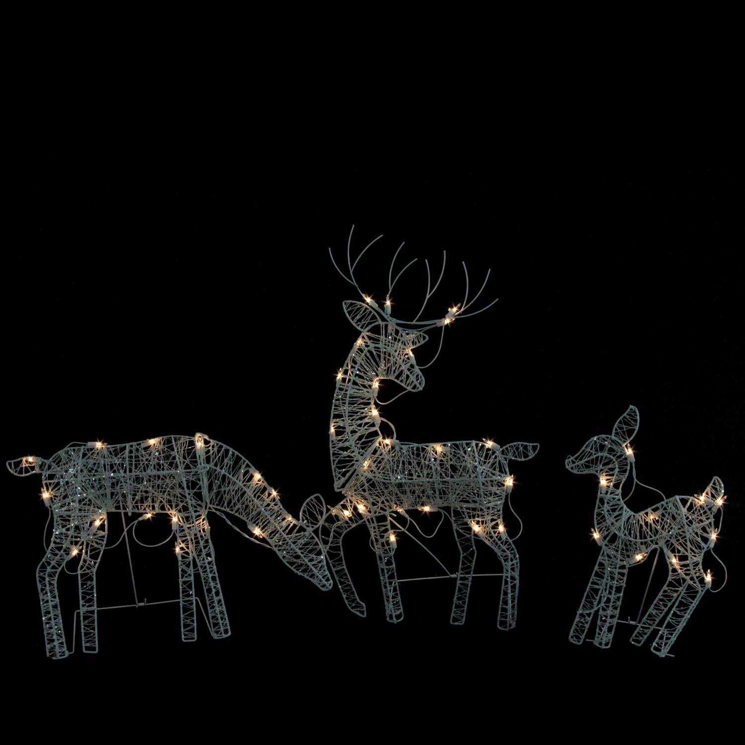 Warm your heart and home with this decoration. These deer are a perfect addition to a Christmas light display creating a winter wonderland. It is sure to light up your yard and bring in the holiday cheer. Product Features: Pre-lit with a total of 50 clear lights Bulb size: mini 60.5″ white lead cord One-sided design – flat backs Deer are connected together and cannot be displayed separately Easy assembly no tools required Contains 1 plug with end connector which allows you to stack multiple lighted items together (not to exceed 210 watts) Lawn stakes included UL listed for indoor or outdoor use Comes with replacement bulbs spare fuse and cable ties Wire gauge: 22 120 volts 60 hertz 0.17 amps 20.4 watts Dimensions: Doe: 15.5″H x 22.5″W x 1.75″D Fawn: 17″H x 10″W x 1.75″D Reindeer: 30″H x 17″W x 1.75″D Material(s): metal/plastic/glass bulbs/wire