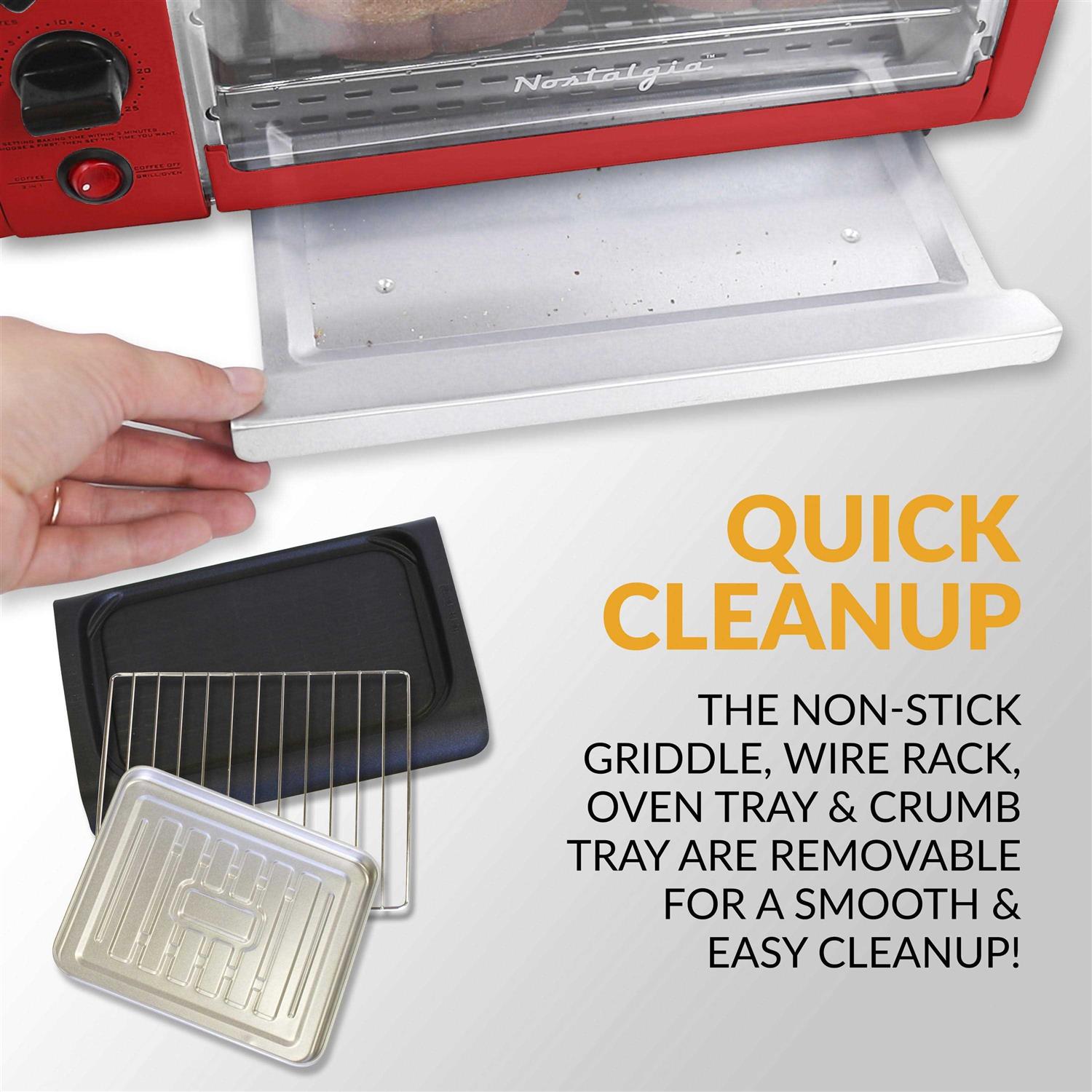 - Easy clean up: As if cooking isn’t easy enough, the oven tray, wire rack, crumb tray and nonstick griddle are removable, making cleanup a breeze