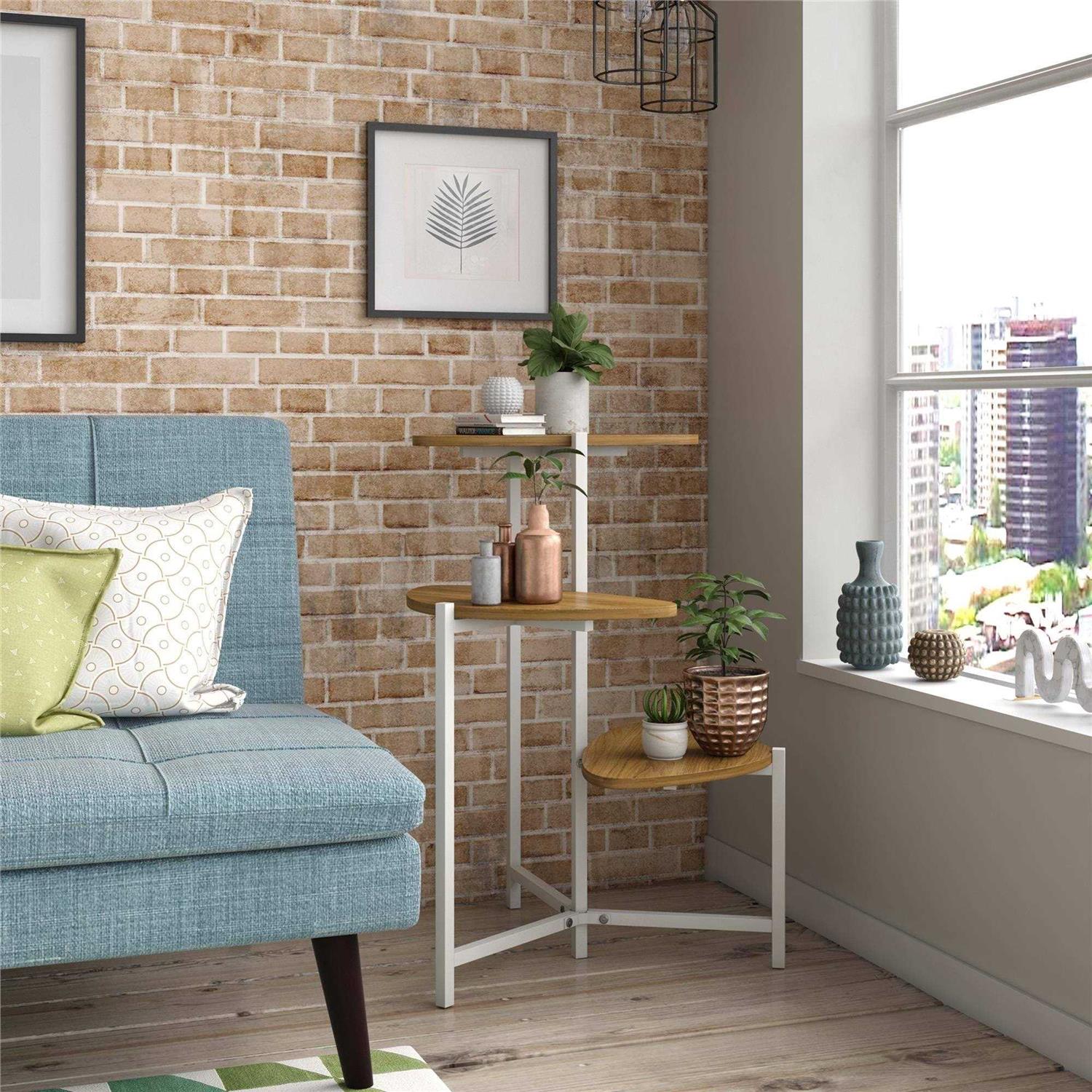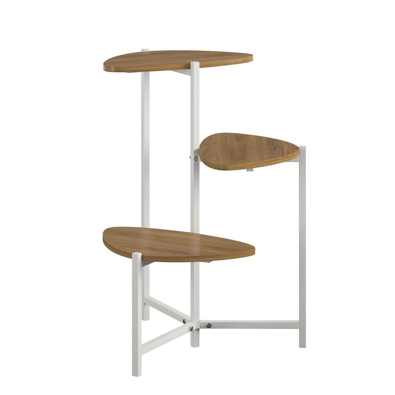 Bring some of the outdoors into your living room with the Novogratz Tallulah Plant Stand. Made of laminated particleboard with a sturdy powder-coated metal frame, the warm walnut woodgrain finish on the shelves pairs perfectly with the white metal frame for a beautiful look for your space. The 3 shelves are perfect for potted flowers and plants and feature a unique shape to enhance your rooms style. The Plant Stand can also be used to display family photos and memorabilia to brighten up any room in your house. Two adults are recommended to assemble. Once assembled, the Plant Stand measures to be 29.7”H x 21.1”W x 21”D.