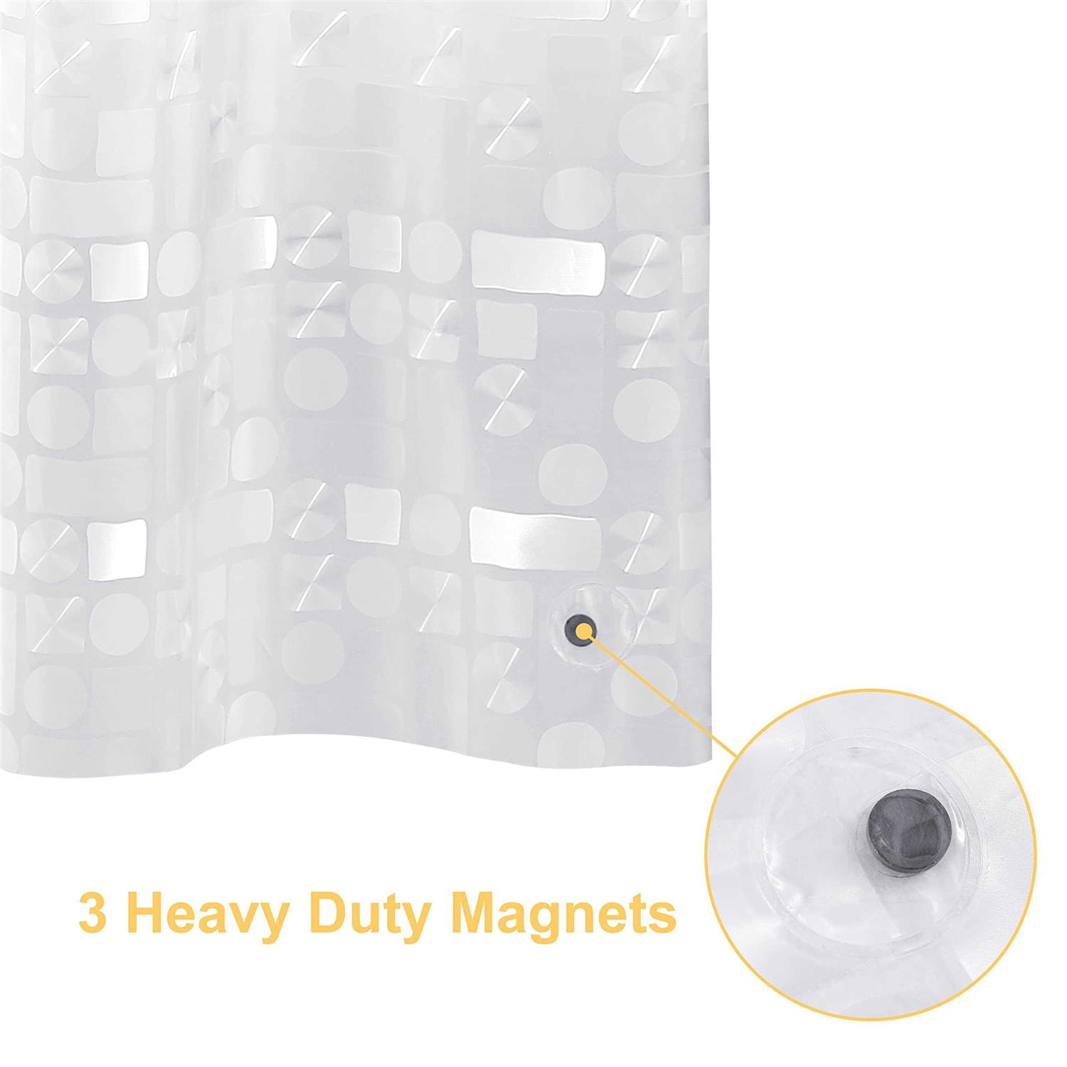 - PACKAGE INCLUDES: 1 Shower Curtain (72 x 72 Inches) + 3 Weighted Magnets + 12 Plastic Hooks