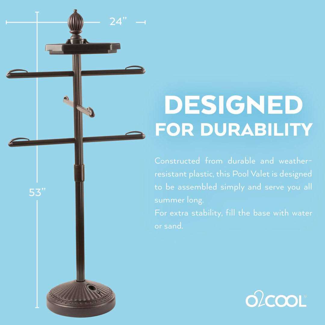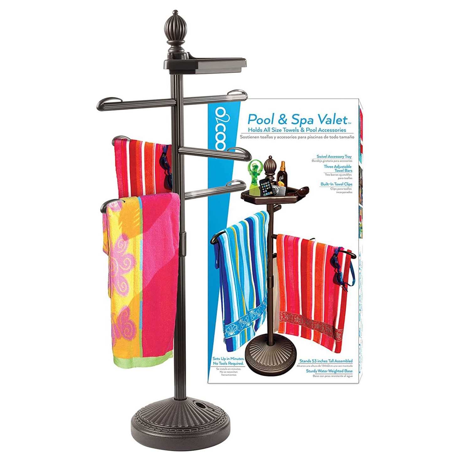 O2COOL’s Pool and Spa Valet is the perfect companion for organizing your towels and pool items at your pool. The stand has three 24 towel bars with clips to hold you towels in place. The top tray swivels to keep your suntan lotion or misting fan handy and in reach. The base can be weighted using water from your garden hose or sand to prevent tip-overs from wind storms. Easy to clean and store. Assembles and adjusts without tools.