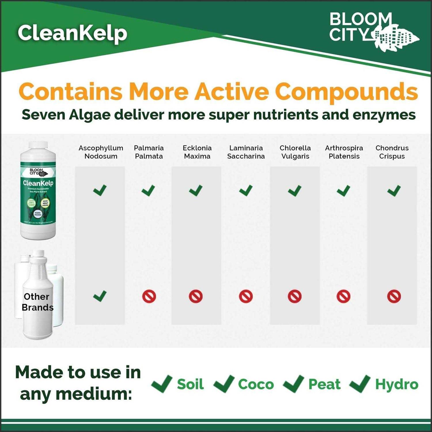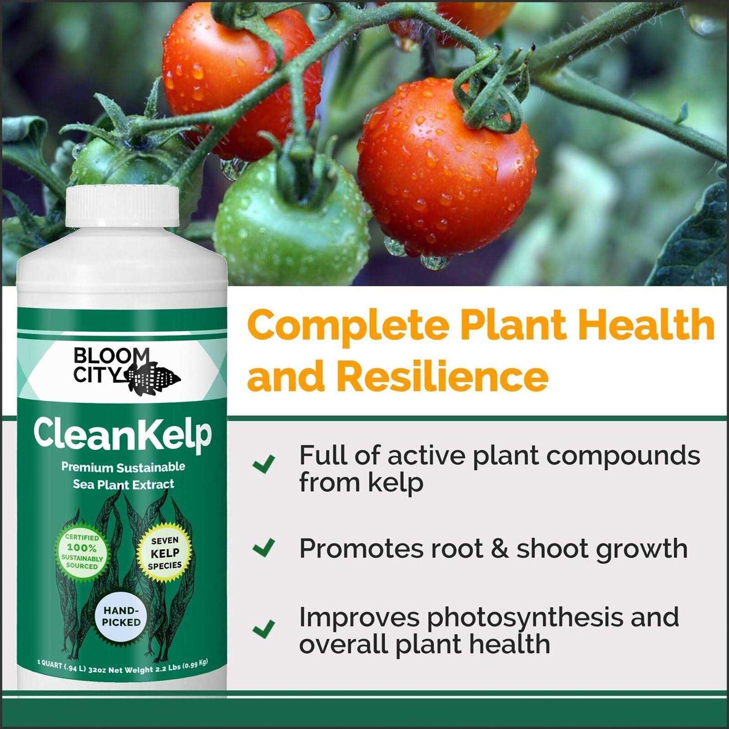 Great for lawns and gardens. Bloom Citys CleanKelp formulation contains more than just ascphyllum nodosum, CleanKelp is made of seven species of wild harvested sea plants that are loaded with vitamins, minerals, and naturally occurring plant growth hormones. CleanKelp improves root and stem growth, and relieves heat and drought stress to ensure plants grow vigorously. Add CleanKelp both indoor and outdoor plants during your everyday watering routine or use it for root dips, foliar sprays and compost teas. Other kelp brands fill their bottles with low quality byproduct and non-nutritious plant matter. Stop paying for filler material. Bloom Citys proprietary extraction methods are gentle and maximize the nutritional benefits of wild sea plants. CleanKelp is rich in naturally occurring enzymes, amino acids, sugars, minerals, growth hormones and macronutrients.Bloom City nutrient systems are an ultra-premium line designed for the craft grower. Our nutrients and supplements are simple to use and produce amazing results. Leave behind the confusing and dirty world of Big-Ag fertilizers and upgrade to Bloom City. Bloom Citys products are made in America from the highest quality sources by a small team of passionate plant scientists. All our ingredients are better for plants, better for you, and better for the planet. Bloom City is simply the best choice for the conscientious grower.
