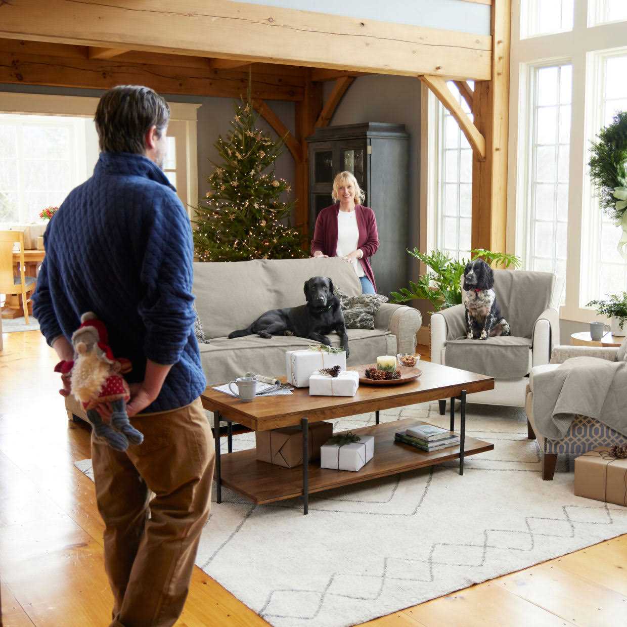 Protect your entire sofa while increasing your dog’s comfort with our Grip-Tight Furniture Protector. This problem-solving furniture cover looks great, feels amazing, and keeps hair, dirt, and moisture off of your sofa. An 8″ flap covers the front of your sofa, while a second flap runs along the back of the protector and tucks under the cushions to prevent movement. The non-slip Grip-Tight backing holds the protector firmly in place, even as your dog moves around. And weights in the arm and back flaps keep the protector from shifting when you’re seated. A breathable, water-resistant membrane protects your upholstery from moisture. Polyester. Washable*. Imported. *Weights need to be removed prior to machine washing and replaced once dried. 26″ seat depth on all protectors.