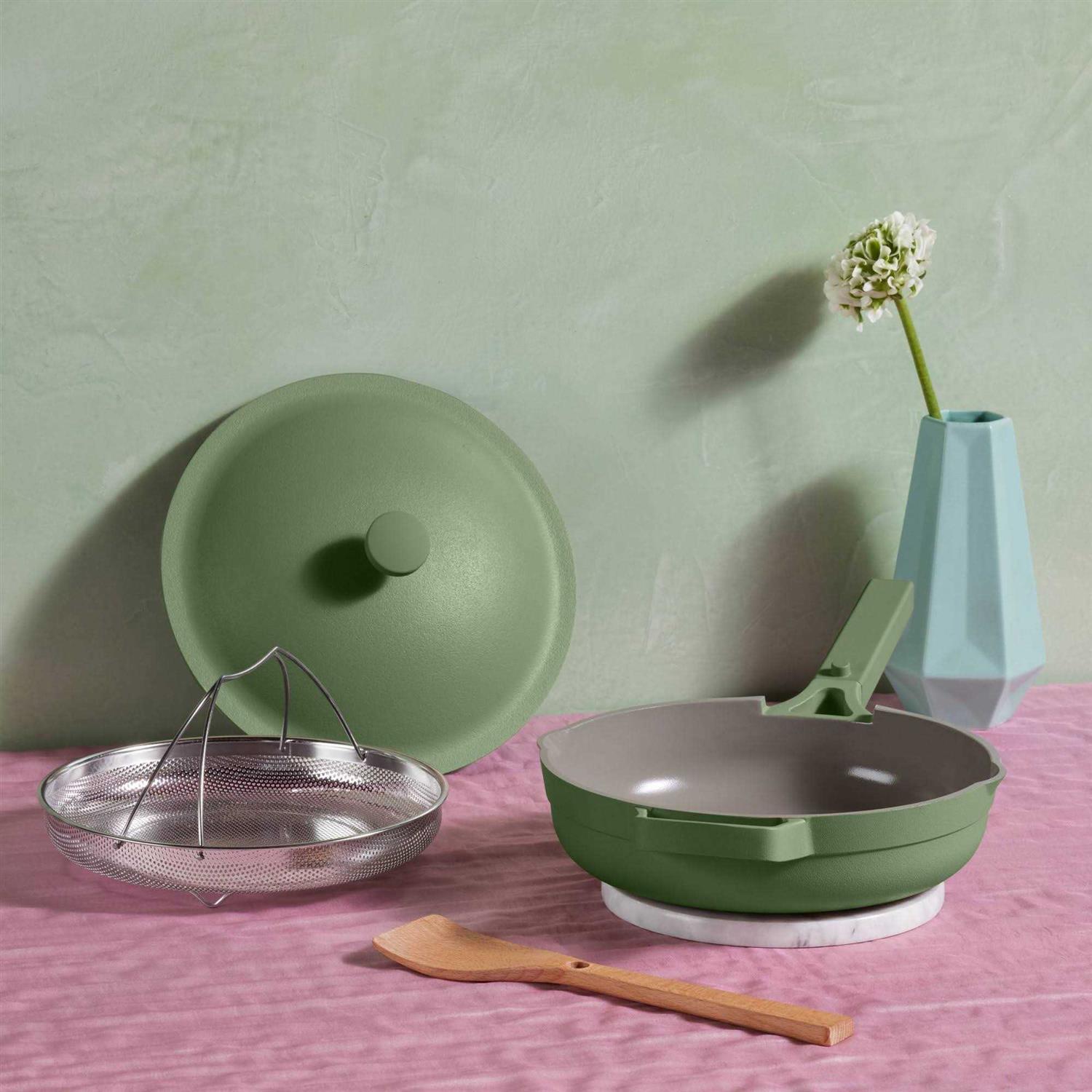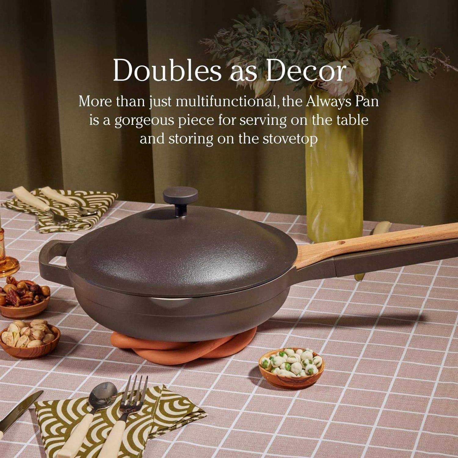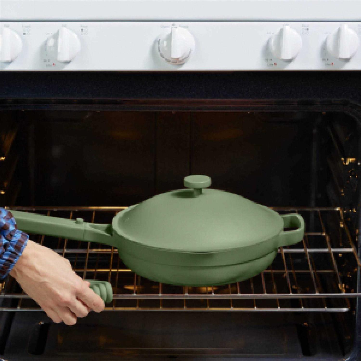 The Always Pan 2.0 does the job of 10 traditional pans, saving you money and cupboard space. The new and improved version is oven safe up to 230°C so you can use it for roasting, baking and slow-cooking. It also has a longer-lasting non-stick coating that makes cooking and clean-up even easier. Available in a range of beautiful colours, the Always Pan is deep enough to boil and strain pasta and shallow enough to sauté chicken and fish. You can braise, sear, steam and deep fry, then take it straight to the table to serve your guests. See the other Always Pan colours and Perfect Pots here. Why choose the Always Pan 2.0? Versatile 10-in-1 pan – save money and cupboard space Deep blue colour looks great in any modern kitchen Made from durable, non-toxic materials High-performance non-stick coating for easy clean-up Compatible with all cooktops, including induction Aluminium interior for fast, even heat The Always Pan 2.0 includes: Steam-release lid Nesting beechwood spatula Steamer basket / colander Care for your Always Pan by washing it by hand and avoiding metal utensils which may scratch the non-stick coating. About Our Place Our Place is an American cookware brand founded by Shiza Shahid and her husband Amir Tehrani. Their mission is to bring people together around the dinner table to share meals, moments and memories. Their beautiful multi-purpose pans will make cooking easier and more enjoyable, whilst taking up minimal storage space.