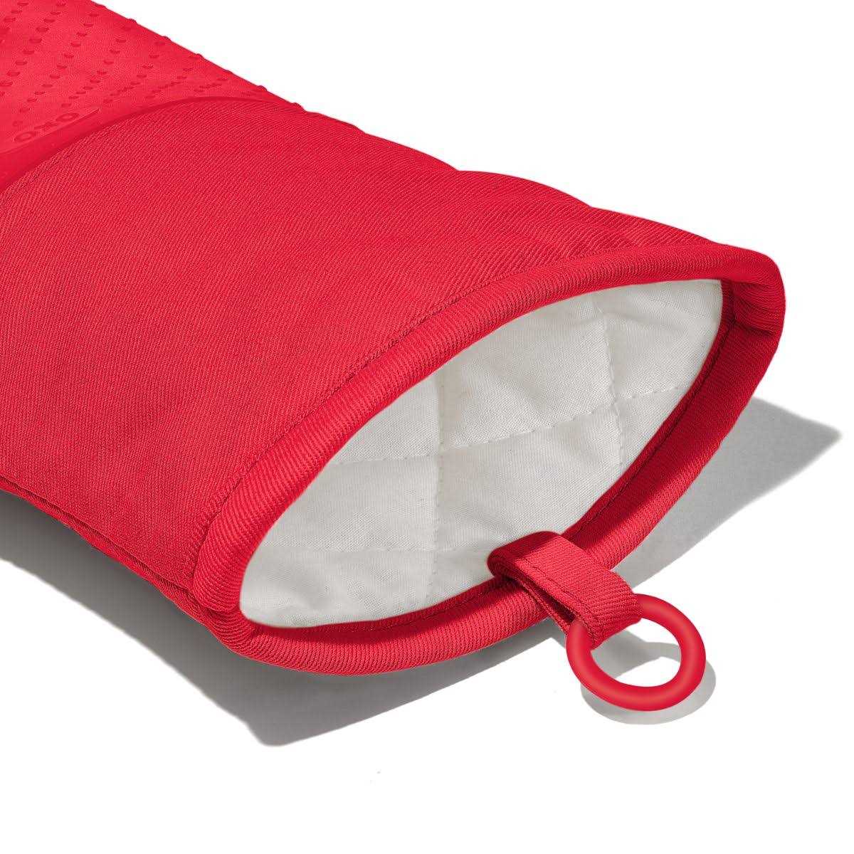 Diamond pattern provides extra protection at contact points Handle hot items safely and confidently with the OXO Good Grips Silicone Oven Mitt. The body is constructed of heat-, flame-, water- and stain-resistant silicone, with a non-slip diamond pattern that’s concentrated at contact points for extra protection. Our 13-in/33 cm Mitt protects your arms with a tapered fit and soft fabric interior that offers control and comfort without sacrificing dexterity. When you’re finished, rinse the Oven Mitt clean, wipe it down with a damp cloth or toss it in the washing machine. Includes hanging loop for convenient storage.