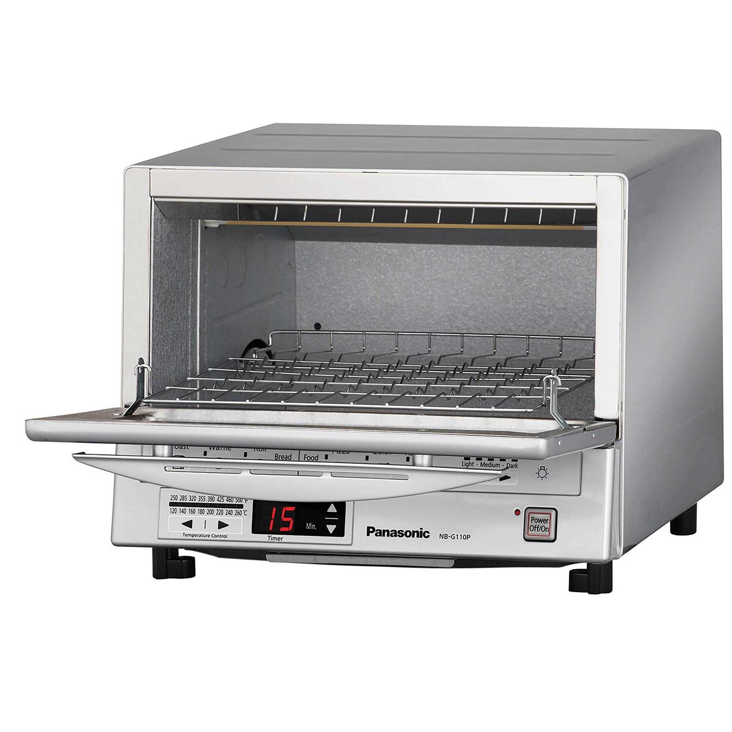 The Panasonic FlashXpress toaster oven features double infrared (near and far) heating which means instant heat, no preheating necessary. Far infrared heating is used to cook the outside of the food efficiently, where as the near infrared heating is able to penetrate the food and efficiently cook the inside. The result is more evenly cooked food in a fraction of the time. The digital timer and temperature settings let you control cooking start time so fresh and frozen foods are ready when you are or with just the press of a button, choose from one of the 6 illustrated preset buttons which automatically calculates the cooking time. Preset cooking modes include toast, waffle, roll/bread reheat, pizza, quick reheat and hash brown. The square shaped inner tray is perfect for pizza up to 9 inches in diameter or four slices of toast. The interior light allows you to view your food while it’s cooking plus a flexible hinged door allows pivoting of the door for a quick peek or turning. Dimensions: 13″ x 12″ x 10.25″. Color: Silver.