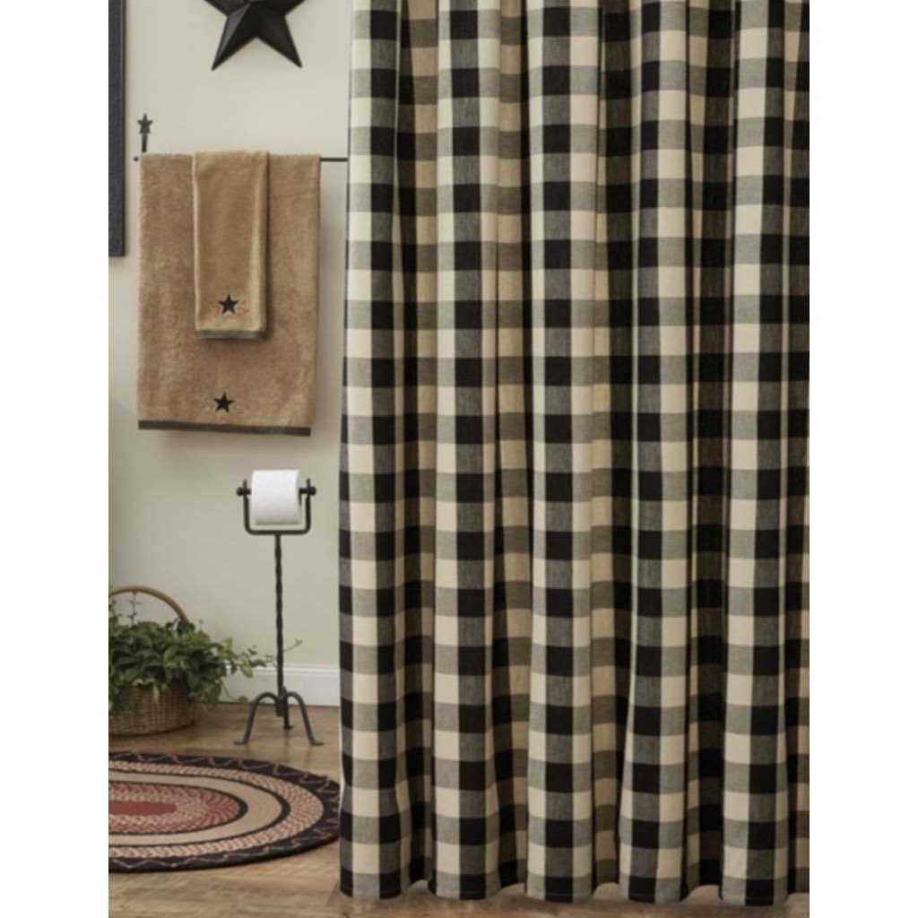Cotton 100% Cotton; Unlined A classic black and tan buffalo check Measures 72 x 72 inches Designed to be used with traditional or decorative hooks (not included) Machine wash / dry Button holes along top for hooks A classic black and tan buffalo check adds country charm to a bathroom. Reinforced button hole openings at the top (hooks not included). Unlined. The warm black & tan blends beautifully to provide a classic farmhouse check that complements any country home design! So charming! Breathe new life into your bathroom with this beautiful shower curtain. The versatile blend of rich black with tan work perfectly together to create a pretty plaid that is full of country charm. The shower curtain features twelve sewn in holes for hanging and ample width and length, so when used on a standard bath, the curtain falls into attractive folds that adds warmth and comfort to the setting. Care – Machine wash cold, gentle cycle; hang to dry.