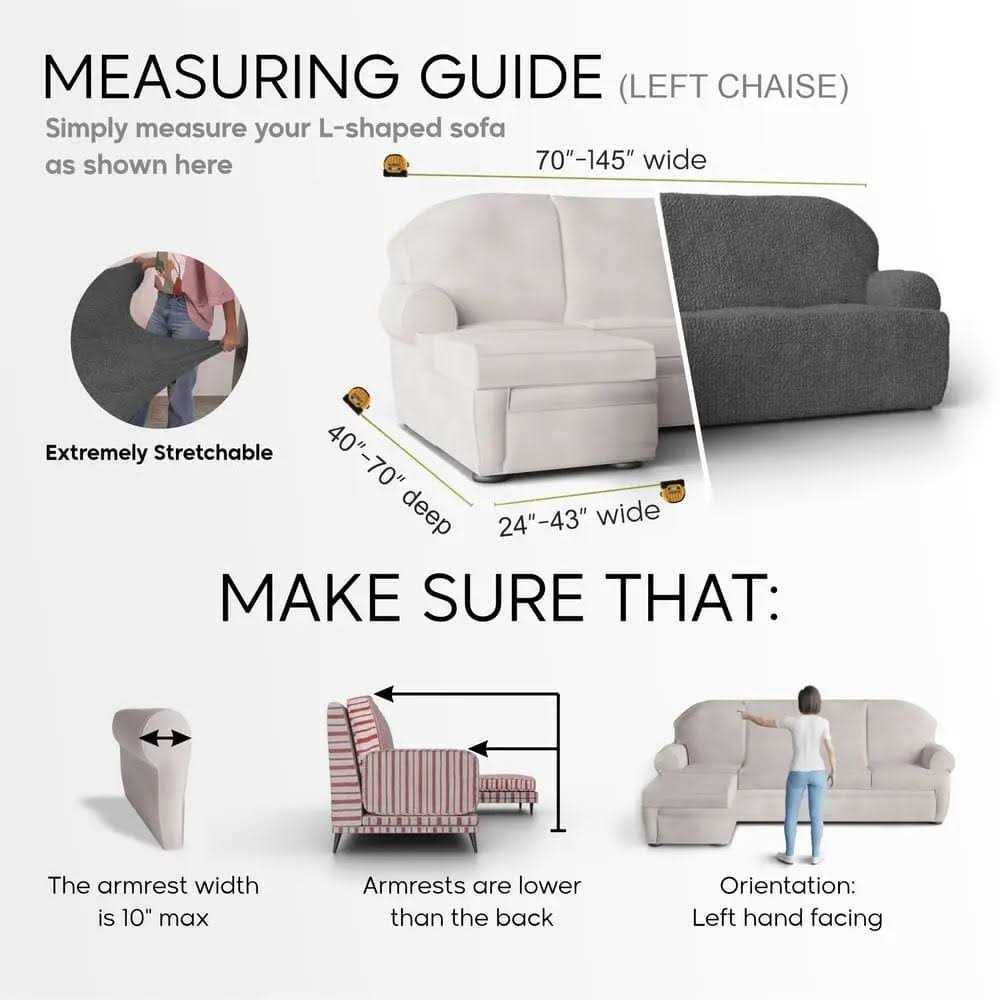 - ONE SIZE: L shaped sofa slipcover fits most sofas with EVEN armrests (see Form Fit guide in photos).
