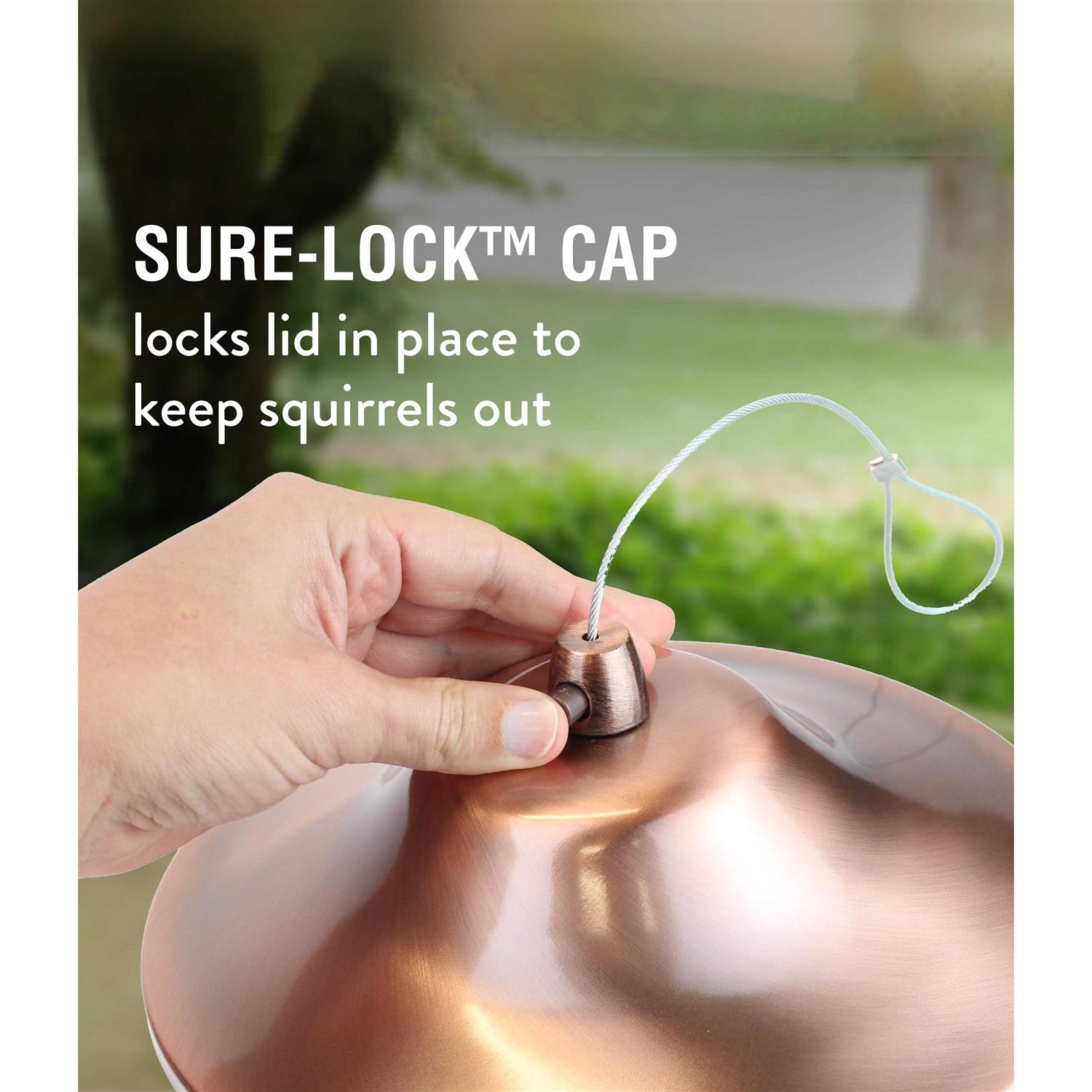 - Patented sure-lock cap system helps keep squirrels out.