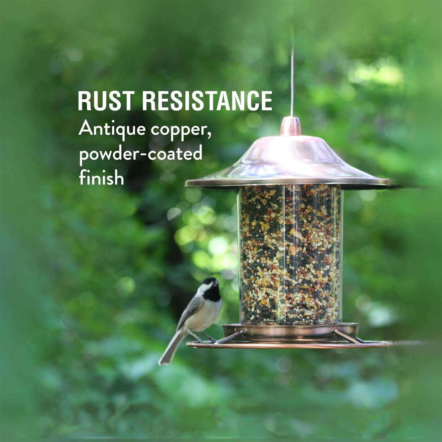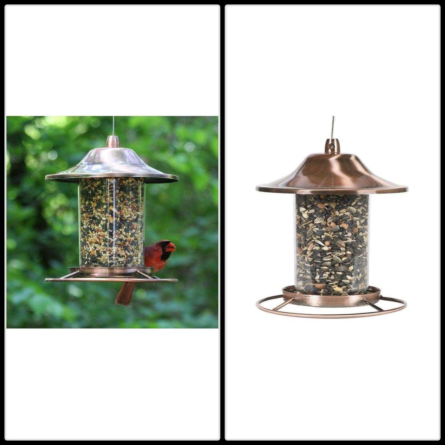 The Perky-Pet Copper Panorama Bird Feeder is sure to attract many birds to your backyard, including cardinals, titmice, nuthatches and more. The innovative design of this feeder allows the seed to dispense into the tray and stops once the tray is full. Simply fill with sunflower seed, mixed seed or any other kind of bird seed. As birds dine, the seed is replenished into the tray so it remains consistently full. Birds will love the circular perch and seed tray combination, which allows for 360-degree feeding. This feeder also features the Sure-Lock cap system, ensuring the lid stays put so squirrels have a difficult time gaining access to the seed. Use the built-in hanging cable to place this feeder anywhere around your yard. The Panorama Feeder holds 2 lb of seed and features an elegant copper finish to make it stand out in any yard. For you convenience, this feeder boasts a wide-mouth opening to allow for easy filling and cleaning. Plus, the clear reservoir makes it easy to monitor seed levels at a glance.