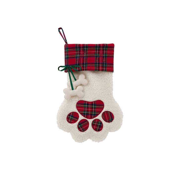 - Stocking features a paw shaped design with red plaid paw prints and cuff. A bone also dangles from a satin ribbon