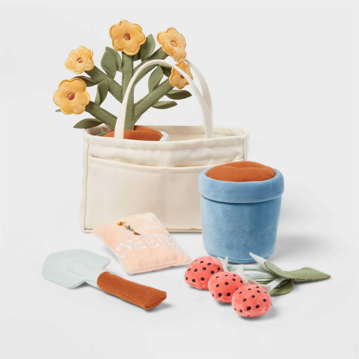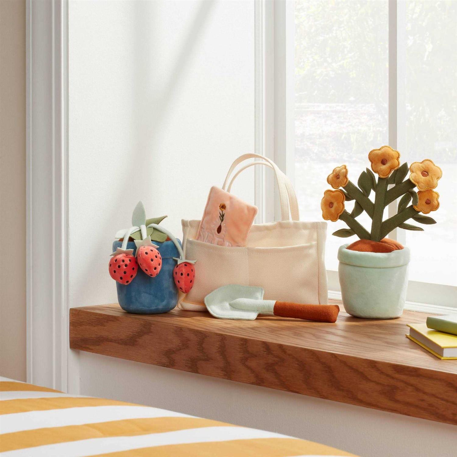 Make playtimes fun for your kid while adding sweet charm to their room with this Play Set from Pillowfort . This throw pillow set includes pieces to resemble a real gardening kit and it includes two pots, two bunches of flowers, one seed packet, one spade and one gardening tote with front pockets. Made from canvas fabric with soft filling and showcasing bright hues, these cute little throw pillows bring cute charm to their room, while giving them fun options for playing.