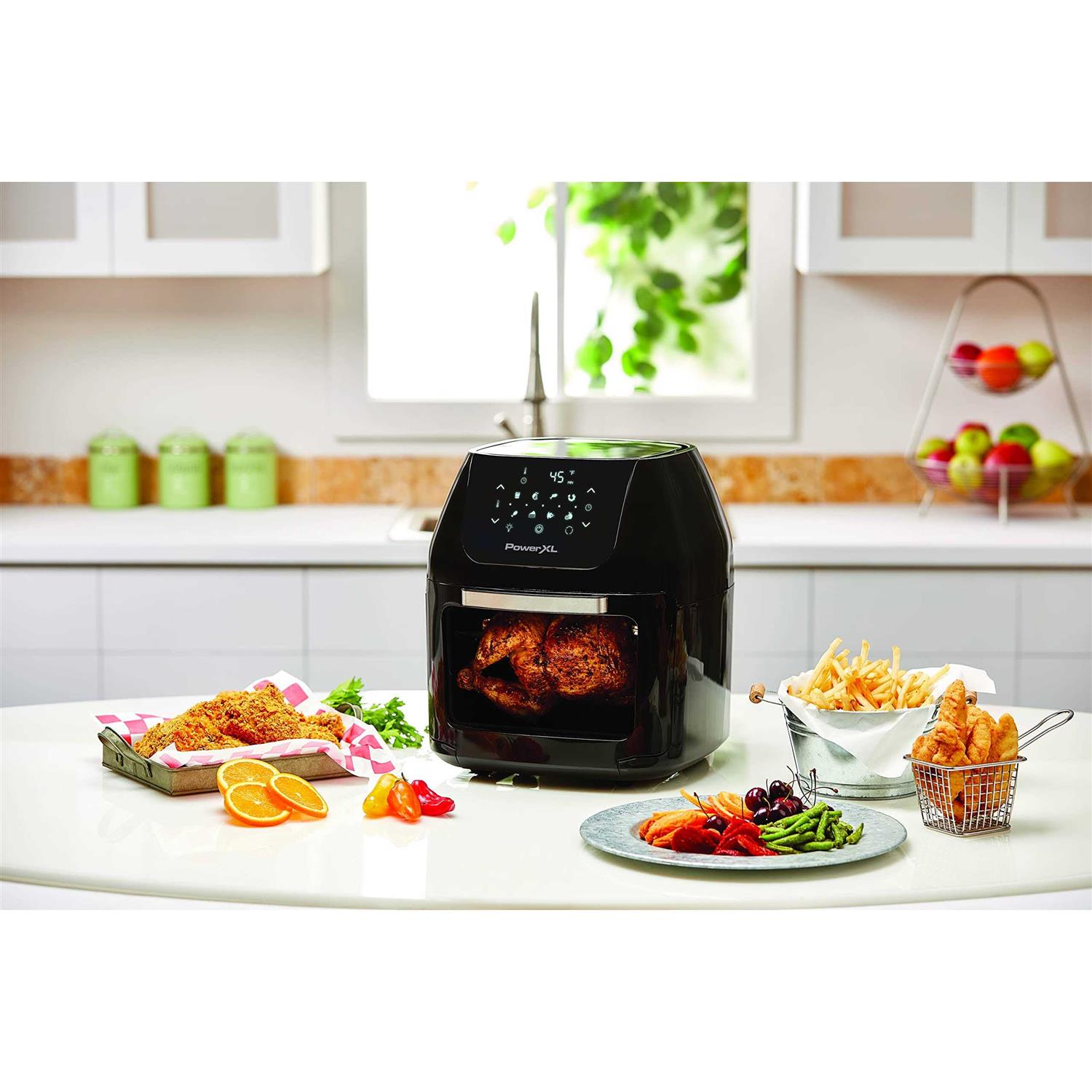 The PowerXL Air Fryer XLT gives you all the crisp, juicy, delicious, healthier benefits of oil-free air frying at the touch of a button. You get a state-of-the-art air fryer with the added versatility of a rotisserie and dehydrator all in one.
