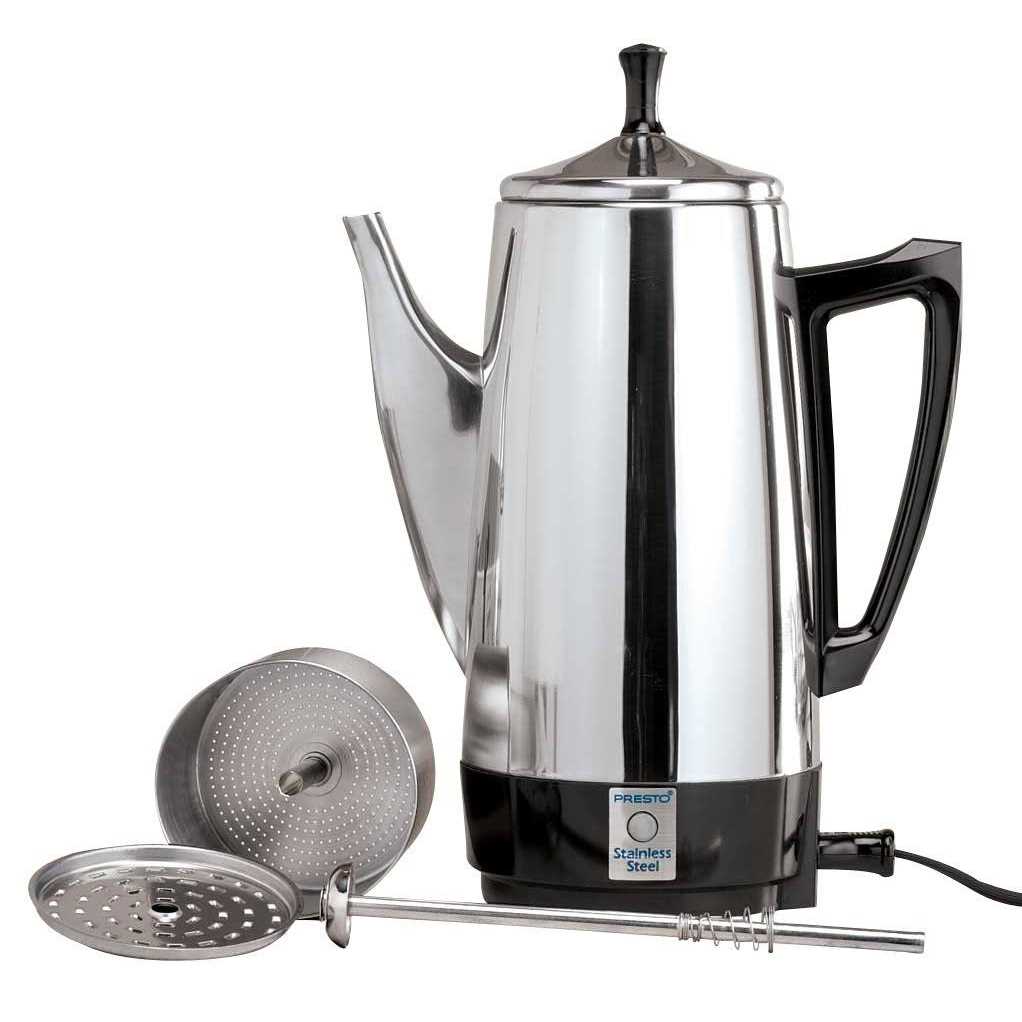 Presto Make yourself a quick cup of aromatic coffee with the Presto Stainless Steel Perk Percolator. This coffee maker is generously sized to make up to 12 cups. This coffee maker is made of premium quality stainless steel, which ensures that it is sturdy and durable. It sports a stainless steel finish that gives it a smart and compact look. This 800-watt coffee maker is shatter-proof, and resistant to rust, staining, odour, scratching, and warping, which helps extend its durability. It includes a permanent basket filter, made of stainless steel, which can be removed for easy cleaning. It features a quiet brew option for smooth and quiet operation. The complete brew indicator notifies you when the coffee is ready to be consumed. Easy to care for, the basket is dishwasher-safe while the other parts of the coffee maker can be wiped clean using a soft, dry cloth to keep it looking as good as new for years to come. It is UL listed as safe for you and your loved ones.