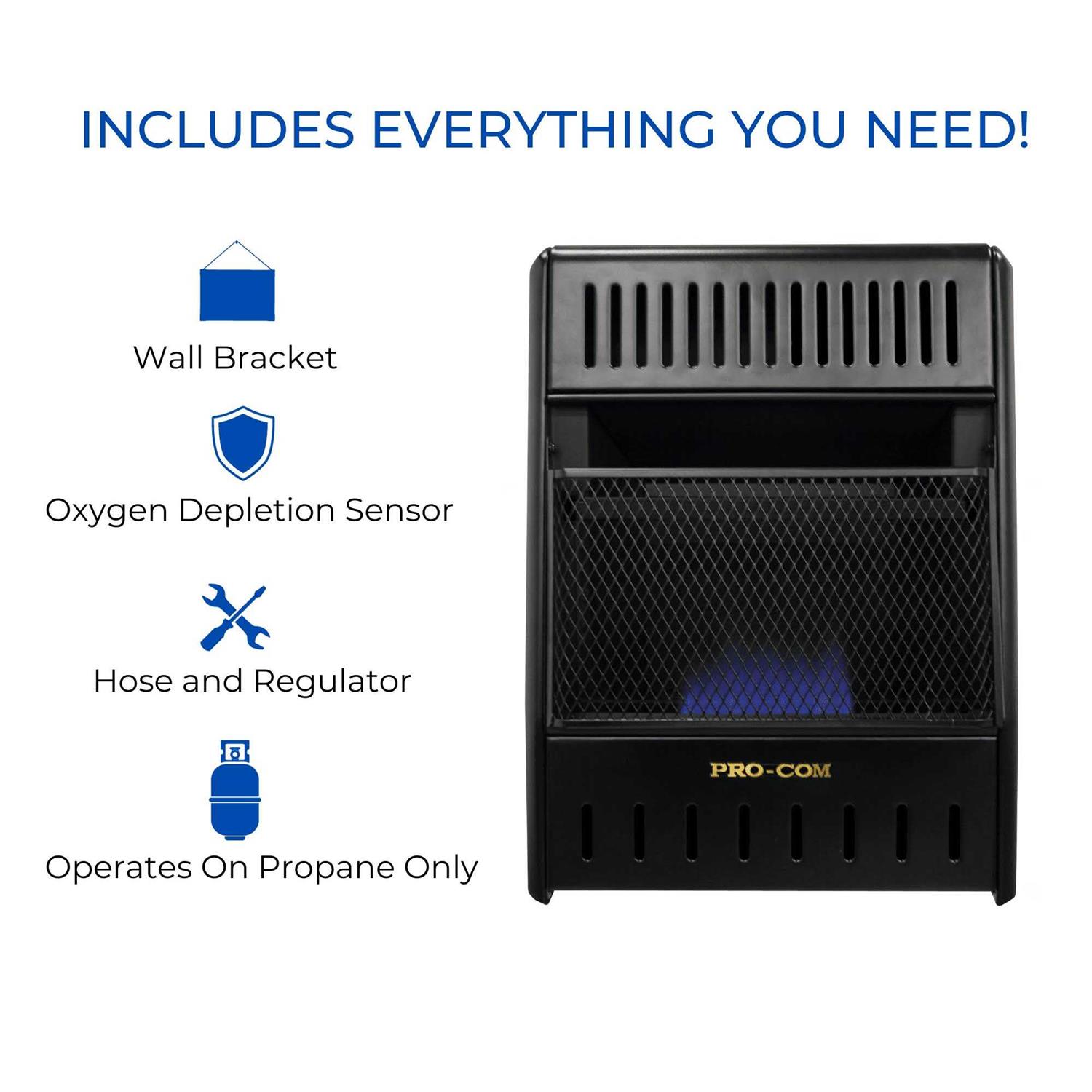 ProCom’s Blue Flame Vent-Free heaters make keeping warm in the outdoors quick and easy. Just push a button for easy ignition, stand back and enjoy a great source of dependable, affordable heat. ProCom’s Blue Flame vent-free gas space heaters heat the air first, circulating the warmth through the room, much like your central heating system. These gas space heaters operate 99.9% efficient and allow you to enjoy continuous heat even during a power failure, these heaters operate without the need of electricity.