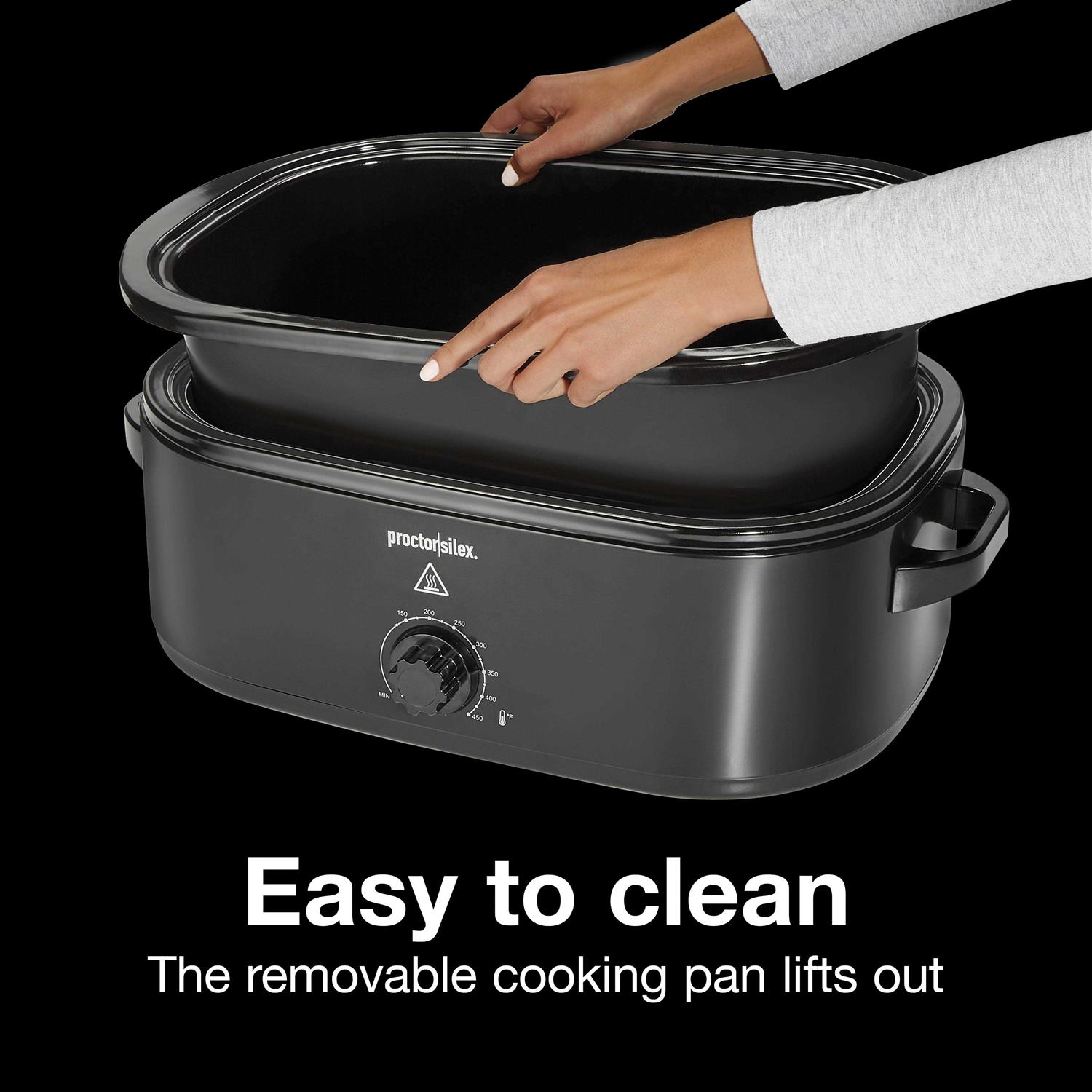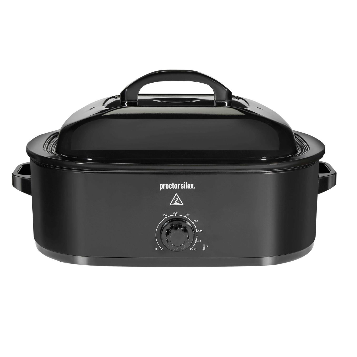 The versatile 18 quart Proctor Silex Electric Roaster Oven is perfect for holidays and special occasions because it easily adds extra oven space in your kitchen when you need it. The roaster oven doubles your oven space and is easy to use. It holds a 24 lb. turkey and is great for cooking large meats, but you can also use it to steam vegetables, bake potatoes, and even to make cheesecake. This versatile roaster oven steams, slow cooks, bakes, roasts, and keeps food warm for serving guests. Easily adjust the temperature from 125 to 450 F with one simple knob, to perfectly cook a variety of foods. You’ll love the convenience of preparing your favorite foods in one pan, in a roaster that’s simple and intuitive to use. The removable cooking pan conveniently lifts out for easy cleaning too. And the included lift-out rack makes it easy to lift large meats, like baked ham and roasted turkey, from the roaster oven. The large capacity of the roaster oven makes it perfect for entertaining, whether you’re feeding friends and family or hosting a special event. It’s designed with quality and durability in mind.