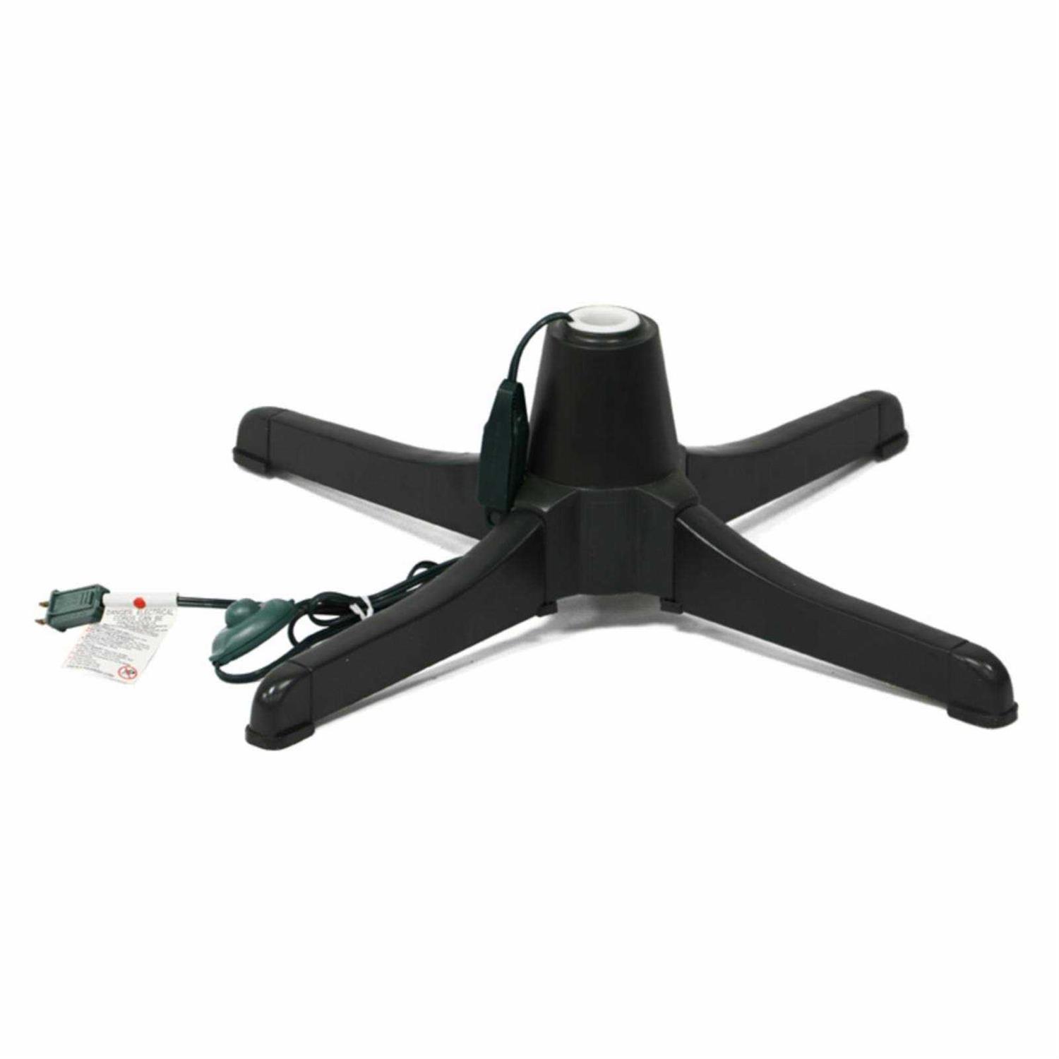 Durable metal construction. Glossy black finish. Offers 360-degree rotation. Features an on/off pedal for convenience. Suitable for artificial Christmas trees. Intended for indoor use. Enjoy seeing every angle of your Christmas tree when you support it with the Puleo International Rotating Tree Stand for 7 to 7.5 Christmas Tree. This beautifully crafted tree stand features a durable metal construction. Plug it in and watch as the stand provides your tree with 360-degree revolution. Operate with a convenient on/off pedal.