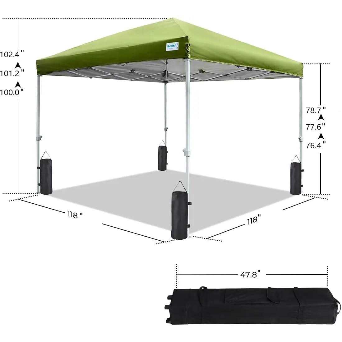 Prevent insects. 10×10 screen house features four mesh side walls to give you a safe, mosquito-free environment. This allows you to enjoy quality time outdoors in comfort. Water and UV resistant. 10×10 pop-up canopy fabric is made of 420D Oxford with PU coating for superior UV protection and water resistance. Easy to install. Since the frame of this 10×10 pop-up canopy comes assembled, you can easily pop it up and get a shade tent in minutes! Great portability. The spacious roller carry bag takes portability to a new level – you can effortlessly move the tent, sandbags, drawstrings, and stakes around in one package. Spaciousness. Measures 10×10 feet, giving you 100 square feet of covered space.