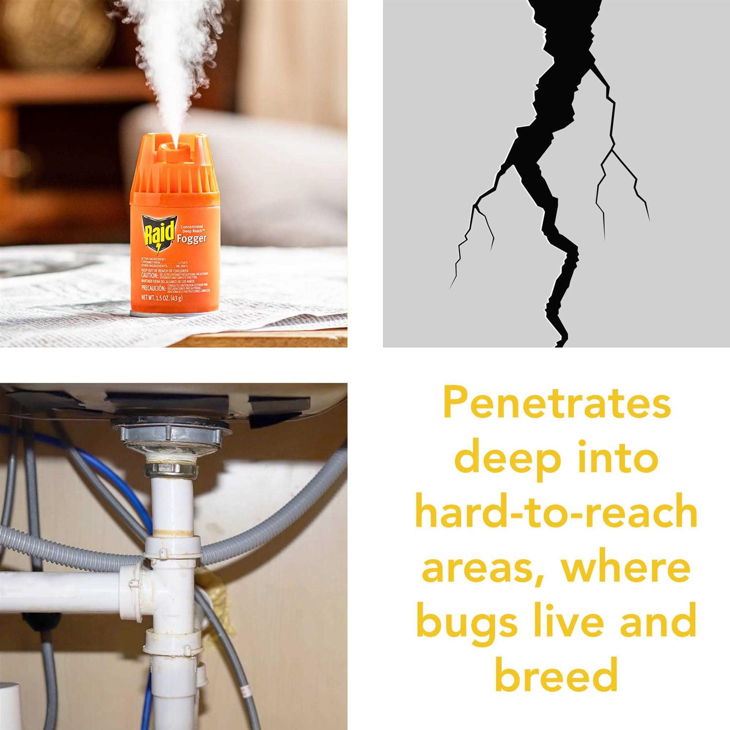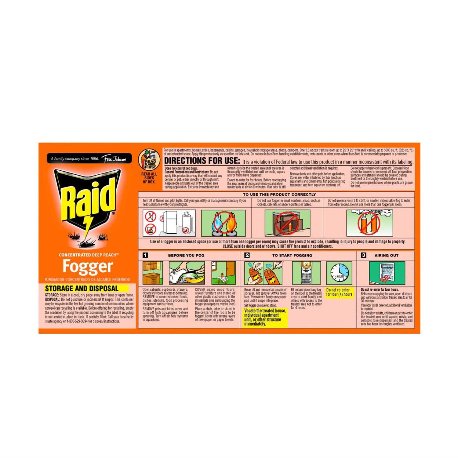Raid Concentrated Deep Reach Fogger uses a bug killing fog to kill roaches and fleas in the hard-to-reach areas inside of your home. The insecticide fog treats an entire room with residual killing action against roaches for up to 2 months. The bug killer fog covers an area of up to 5,000 cubic feet and can even dissipate into closets and small areas within a room. Each Raid Concentrated Deep Reach Fogger kills ants, black carpet beetles, crickets, earwigs, fleas, houseflies, mosquitoes, palmetto bugs, pillbugs, rice weevils, roaches, saw toothed grain beetles, small flying moths, spiders, ticks and waterbugs.