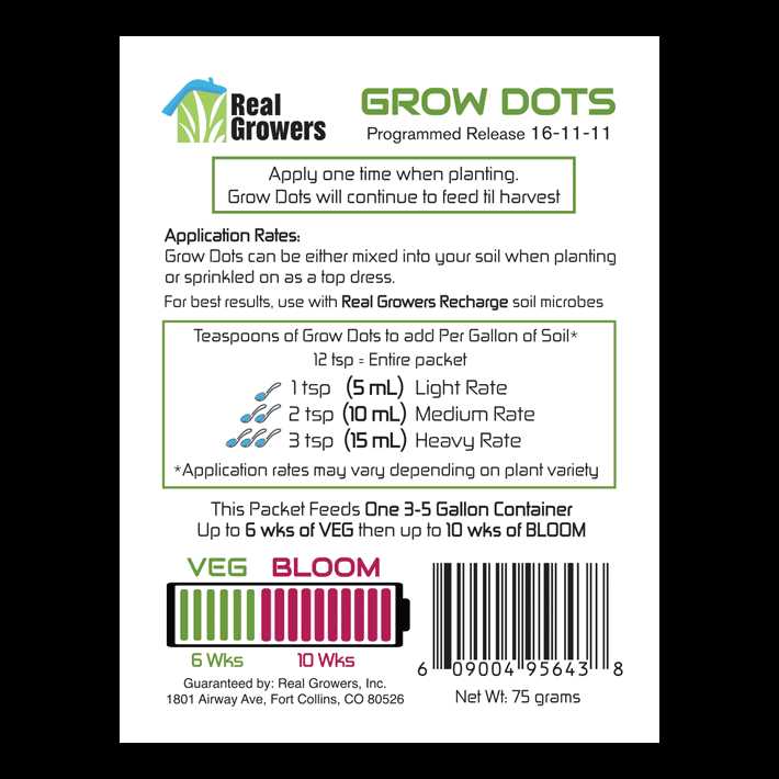 One application feeds your plants up to a 16 week grow cycle Programmed release N-P-K for Veg and Bloom 4 – 6 weeks of heavy Nitrogen for leafy greens in Veg Up to 16 weeks of Phosphorus and Potassium for fuller flowers in Bloom Calcium and Magnesium for stronger plants during your full grow cycle Grow Dots Programmed Release Plant Fertilizer. Save time, energy, and money by using Grow Dots in your garden. Mix 75 grams in with up to 5 gallons of inert soil. keeps your plant fed for an entire grow cycle. Delivers Nitrogen and Phosphorus during Veg. Phosphorus and Potassium for Bloom. Calcium and Magnesium slow release for the full grow cycle. Nutrients phase out at the end of 14 weeks, providing an Auto-flush at the end of each grow cycle. Perfect for new growers and busy growers. Easy to use and grows great plants.