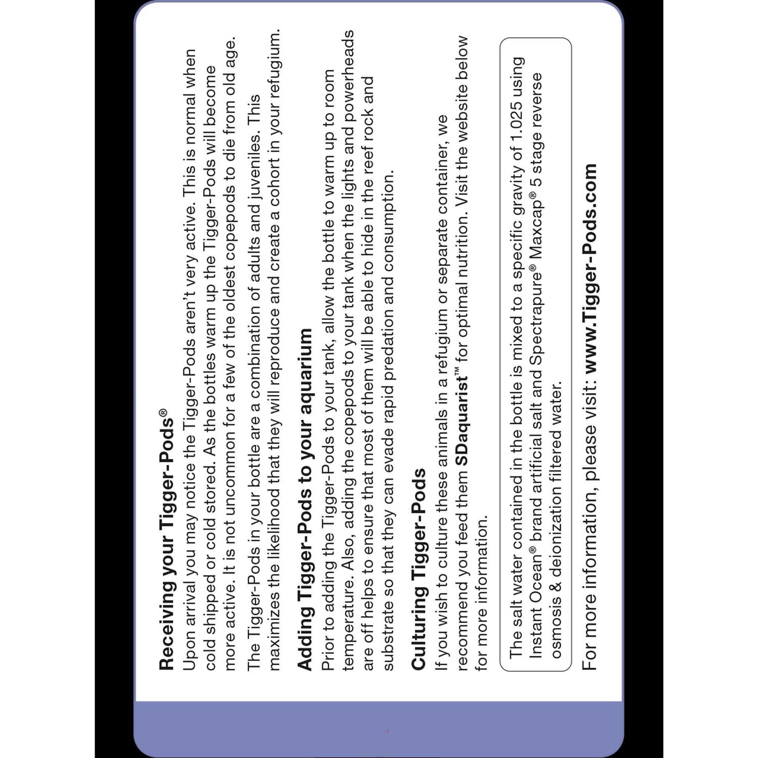 Because Tigger-Pods (Tigriopus californicus) swim upwards with a stimulating, jerky motion, they are attractive to a wide range of fish like Mandarin dragonets, Seahorses and Pipefish. They are easy to culture and perfect for propagation or restocking refugia. They breed rapidly, producing scores of eggs per female. Want to learn more about Reef Nutrition Tigger-Pods?