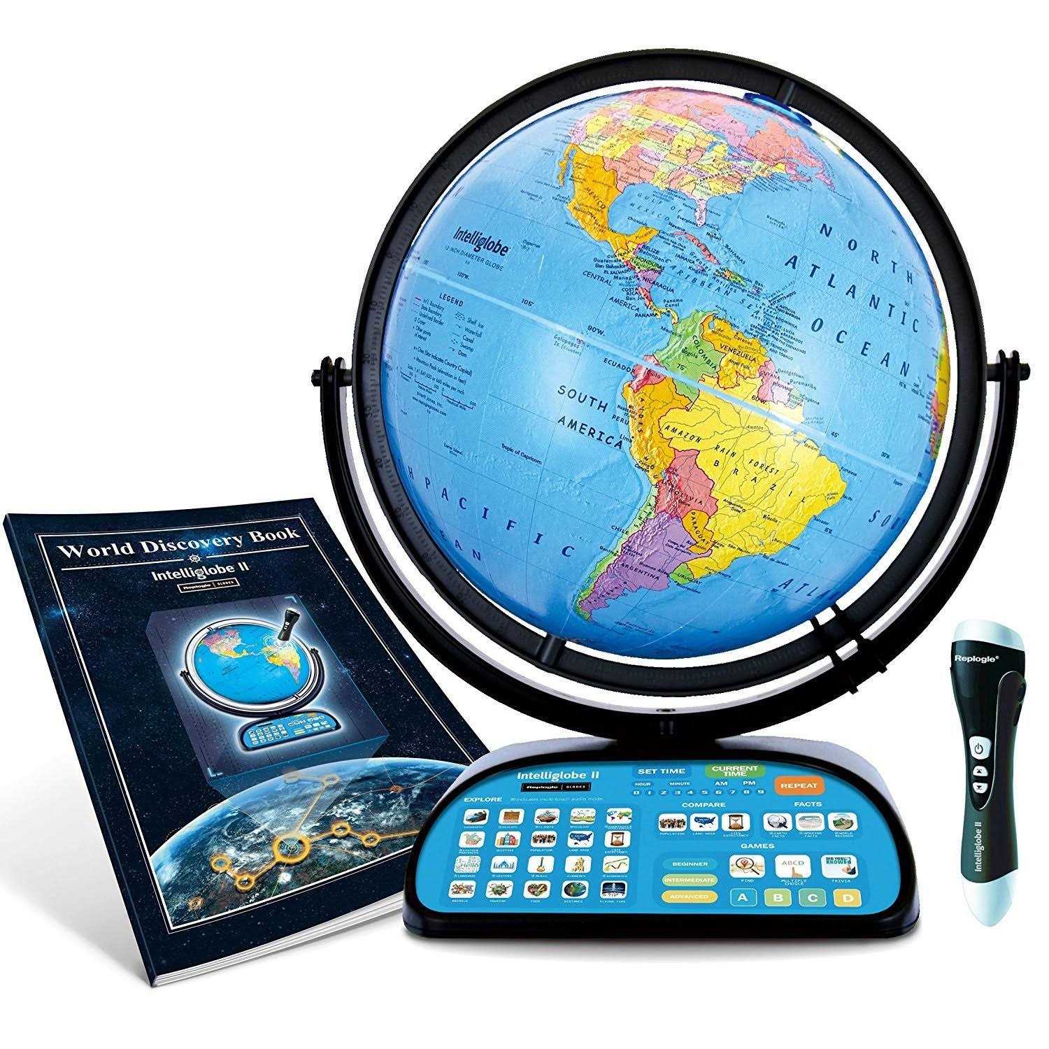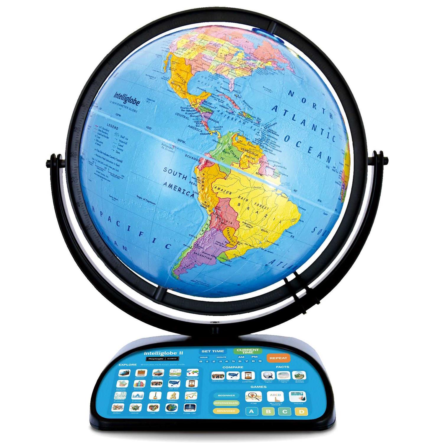 The IntelliglobeTM II Deluxe Interactive Globe is the #1 rated talking and interactive globe for kids! Features a 12″ interactive blue ocean globe with wireless deluxe IntellipenTM and 1000s of fun facts and games. USB cord & batteries included. Mounted on a plastic black or silver base with full-swing meridian. Overall size is approximately 18.5″h x 16″w x 12″d. The IntelliglobeTM II is a fascinating toy that combines the fun of a video game with the knowledge of an atlas and social studies textbook. This educational and entertaining globe contains geography and general information that is truly interesting, useful, and thought provoking. Touch the wireless IntellipenTM to the globe to play games and explore amazing facts about the world.