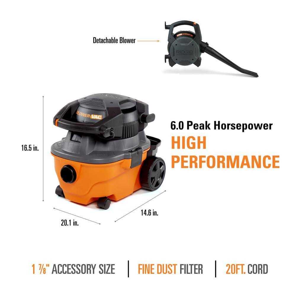 RIDGID 4 gallon wet / dry vacuum is a multi-functional tool that combines portable power and a handheld blower. This compact powerhouse packs a heavy-duty 6 peak horsepower rated motor to tackle even the messiest jobs. The power head of the vacuum detaches and quickly converts into a handheld blower with a locking wand that outperforms most dedicated leaf blowers. The quick-release cord wrap lets you spend less time unwrapping the 20 ft. cord and more time on the job. The caddy conveniently keeps your accessories and the hose close at hand. It is 2 incredible tools in one.