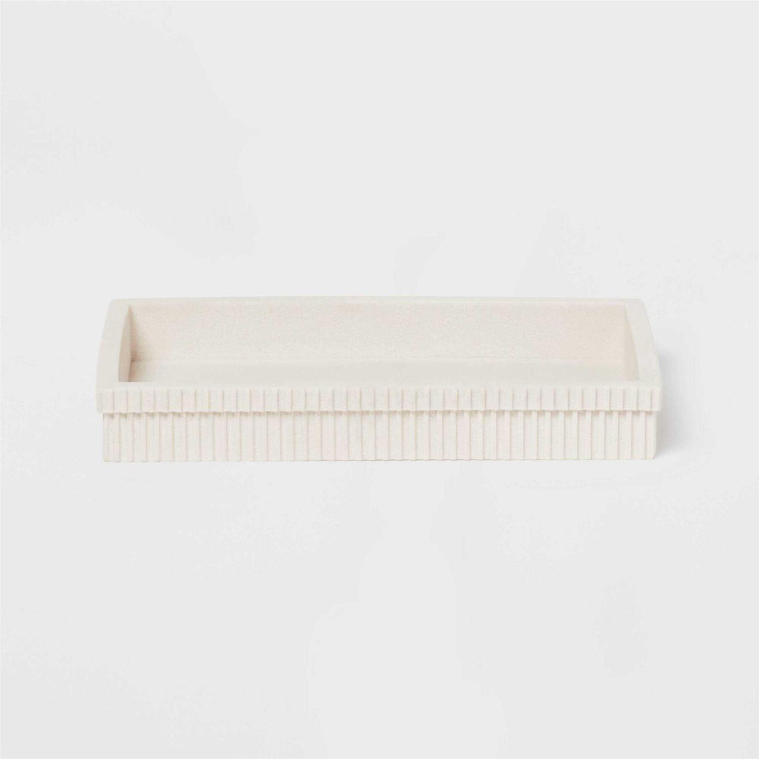 Say goodbye to bathroom counter clutter with this Ribbed Bath Tray from Room Essentials . Designed in a rectangular silhouette, this resin tray features raised edges that help keep small vanity items or bottles contained. Featuring an off-white hue and showcasing a ribbed finish on the sides, it’s sure to bring sleek style to your bathroom decor. Room Essentials : Everyday Value Color: One Color.
