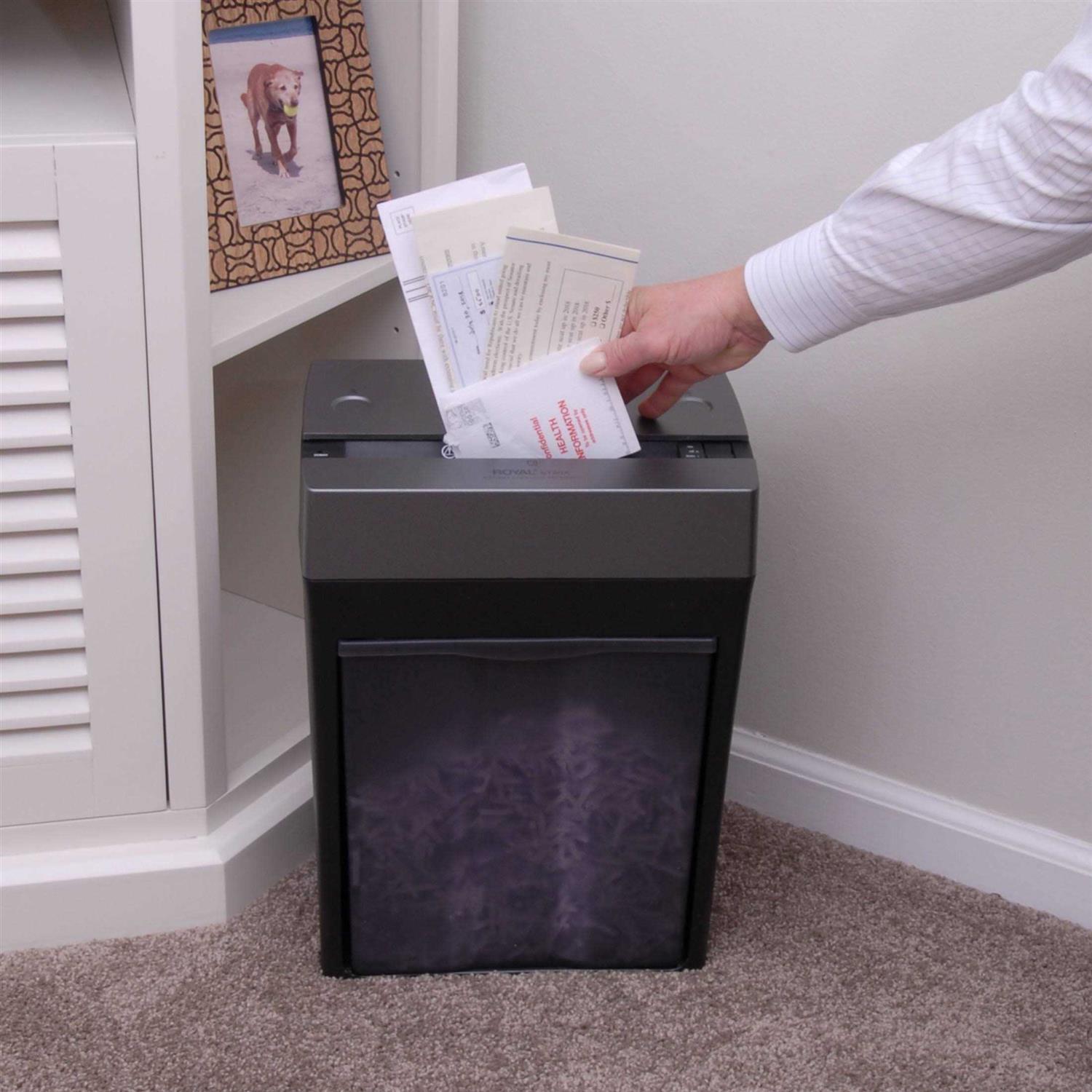 The royal st80x cross cut paper shredder shreds 8 sheet in a single pass.It has a sliding protective top, slide open the shred and slide closed when not in use. It shreds staples and credit cards and has a pull out translucent 2.75 gallon bin for easy cleaning.