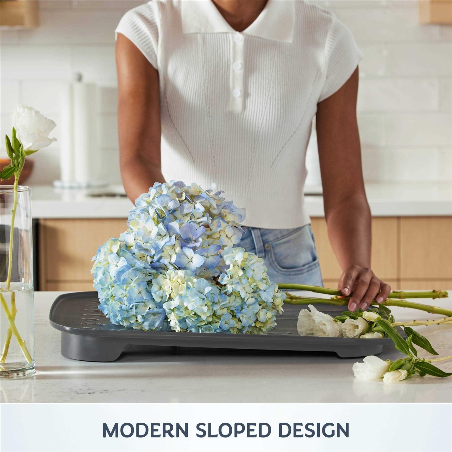 • Dish rack drain board in the color Oyster looks modern while keeping kitchen counters dry.