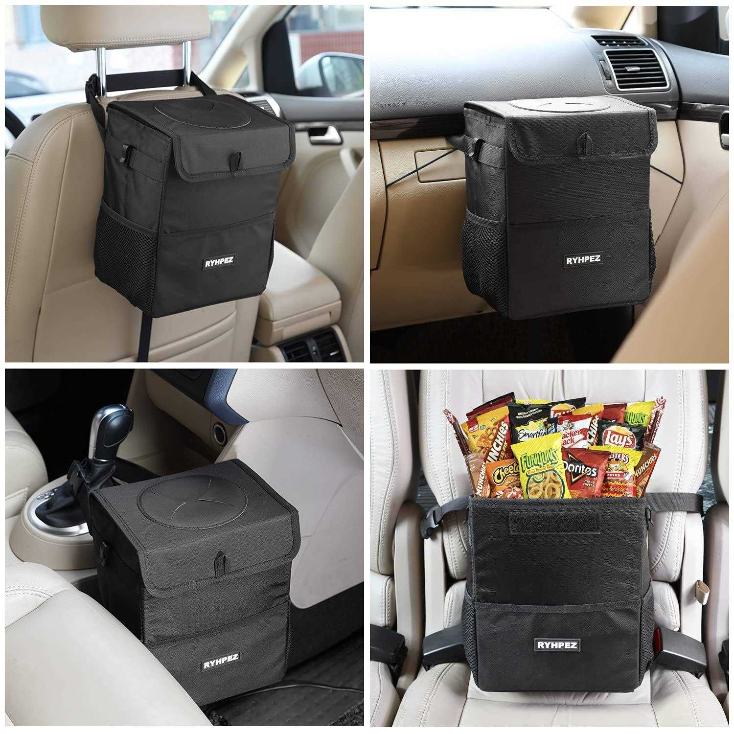 Ryhpez Car Trash Can with Lid Car Trash Bag Hanging with Storage Pockets