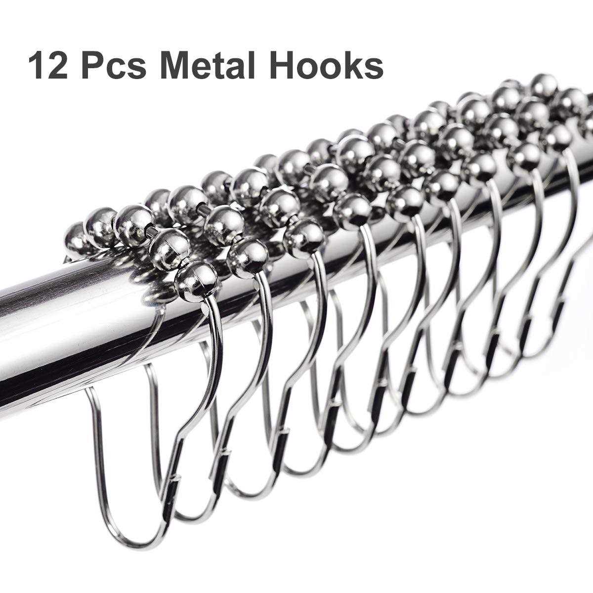 Rustproof Metal Hooks and Grommets – The hooks are designed to be semi-circular to reduce friction with the rod. There are five small roller balls at the top of ring, smooth rolling ball bearings eliminate snagging, tugging and pulling of the curtain, the roller function makes the rings to glide effortlessly across your shower rod.