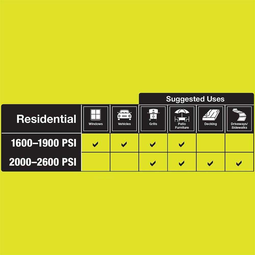- 1900 psi and 1.2 GPM for efficient cleaning of residential areas