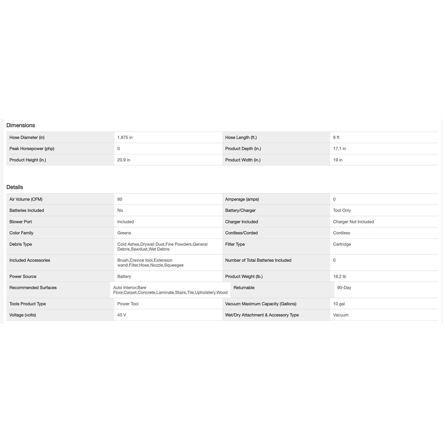 RYOBI introduces the 40V 10 Gallon Wet/Dry Vacuum to our cleaning category This wet/dry vacuum delivers powerful performance with up to 75% more suction compared to the 18V ONE+ 6 Gallon Wet/Dry Vacuum. The on-board storage conveniently holds the included crevice tool, floor nozzle, and extension wands. For added protection, this vacuum features a water resistant battery enclosure that meets IPX4 standards. This wet/dry vacuum operates at as low as 68 dB(A) of sound. The 8 ft. x 1-7/8 in. flexible hose locks securely in place to avoid accidental disconnection. This vacuum includes a cartridge filter for dry applications and a foam filter for wet applications. Replacement filters are sold separately with a model number of A32RF06. This battery operated wet/dry vacuum is compatible with the RYOBI 40V system of tools, batteries, and chargers.
